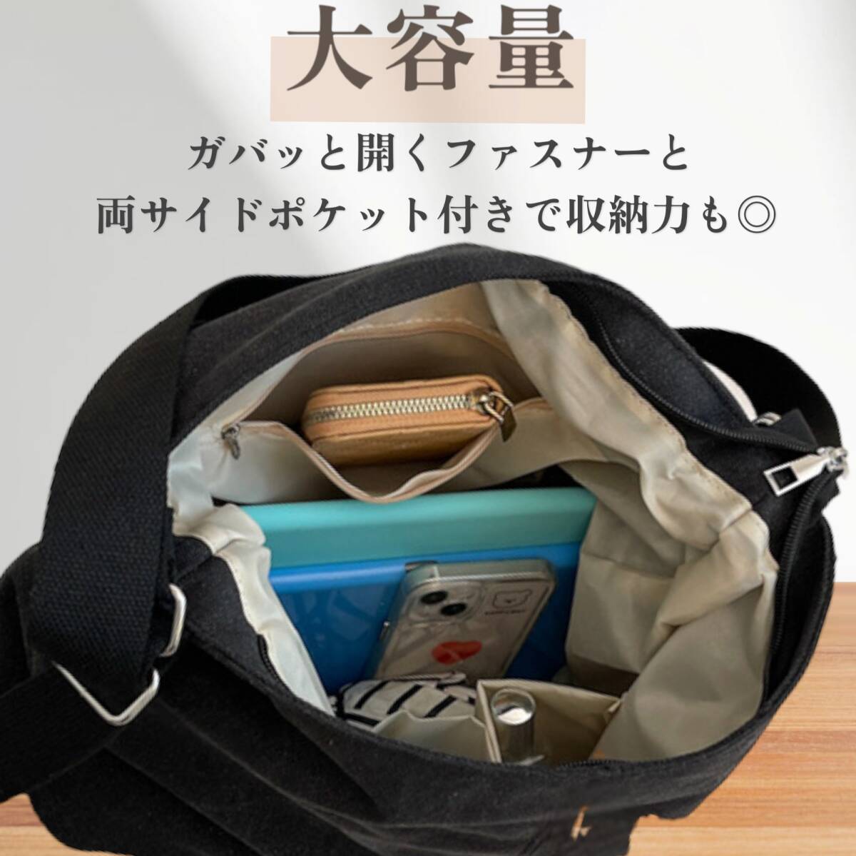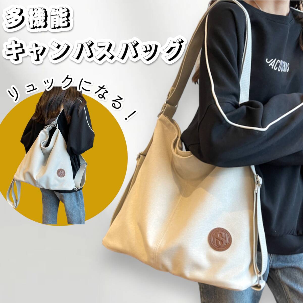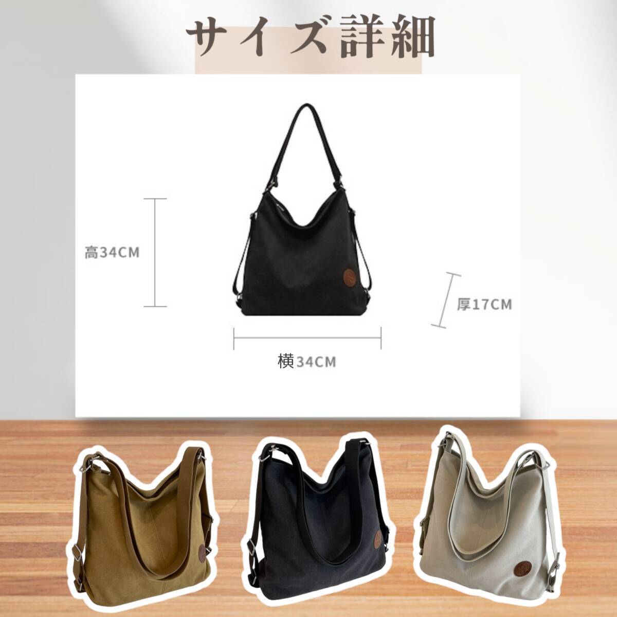 | 商品説明 | 商品説明 【サイズ】横34㎝ 高さ34㎝ マチ17㎝ 【詳細】 表面:帆布 裏地:ポリエステル ジッパー式 ポケット:内側 ジッパー式 1 オープン式 2 背面 ジッパー式 キャリーケースなどに掛けられるベルト付き ●様々な用途に大活躍のトートバッグ ・リュックサック、斜めがけ、肩がけ、ハンドバッグの4wayでお使いいただけます。 ・さらにキャリーケースに取り付けられるベルト付きなので旅行など沢山の荷物があってもOK ・チャック式のポケットなので盗難、落下防止にも◎ ・素材は柔らかくも耐久性抜群で使いやすい ・通勤、通学はもちろん、アウトドア、旅行など様々なシーンに大活躍 |