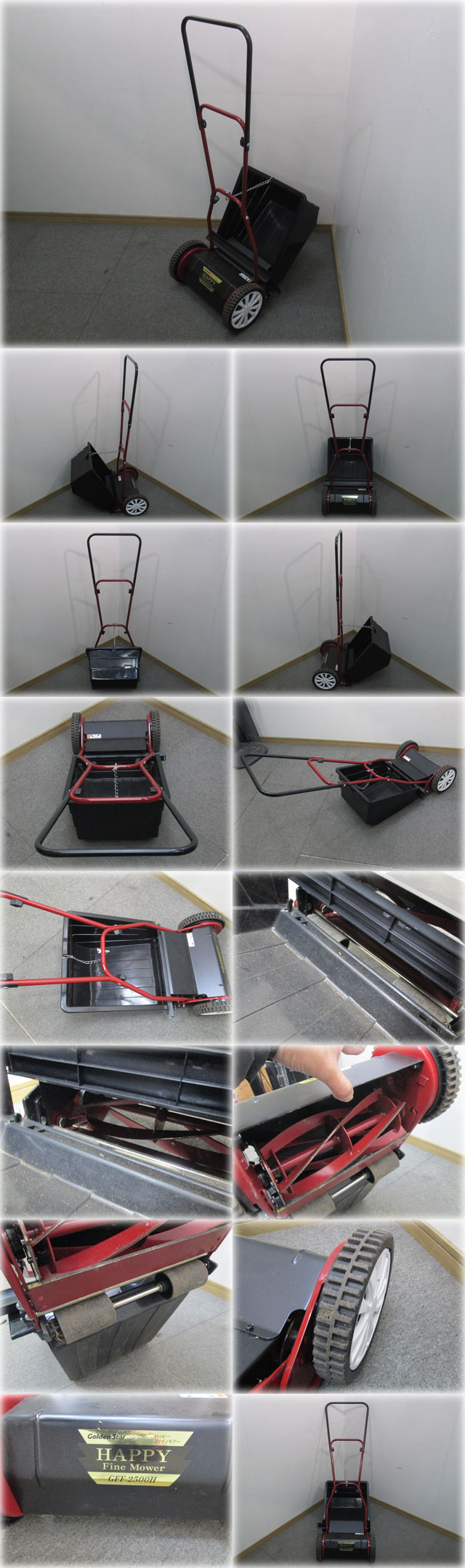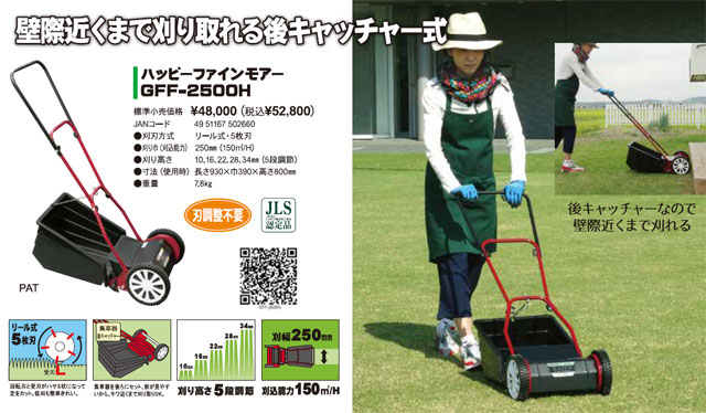 ゴールデンスター(キンボシ) 手動芝刈機 ハッピーファインモアー GFF-2500H を出品いたします。 ■特徴■ 常に一定の力で受刃と回転刃が すりあう刃調整不要 壁際や障害物があっても 刈りやすい後ろキャッチャー リール式5枚刃 回転刃と受け刃がハサミ状になって芝をカット。 低刈も簡単きれい。 集草器後キャッチャー 集草器を後ろにセット、 前が見やすいから、 キワ近くまで刈り取りOK。 刈り高さ5段調節 10mm/16mm/22mm/28mm/34mm ■仕様■