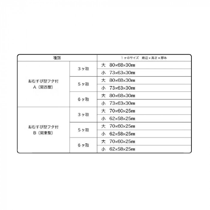 | サイズ | A.関西型 5ケ取(大)サイズ(底辺×高さ×厚み):70×60×25mm 個装サイズ:45×9×3cm |