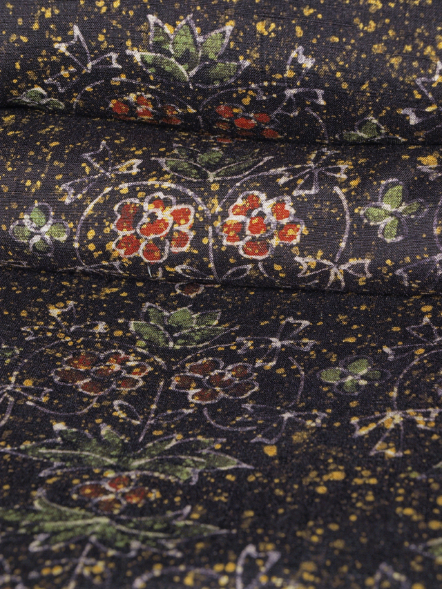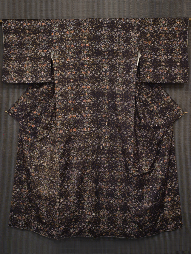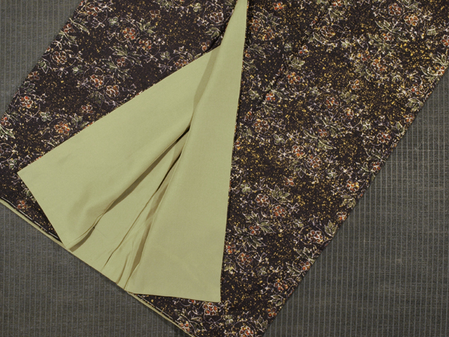 やや紫色がかった憲法黒茶色の地に、蒔糊(まきのり)で中黄色の霜降りの地紋と、唐花でかたどられた格子縞の文様が染められている紬です。袷仕立てです。 かわいらしさのあるお色目であらわされた唐花がシックな地色にマッチして、モダンな小粋さを醸しています。近くではわかりませんが、遠めで見ると唐花が格子状になっているのもおもしろみがあります。やわらかな手ざわりで、ほっこりとした紬らしい紬地です。 しつけ付きの仕立て上がり未使用保管品で、しみやよごれ、褪色などのダメージもありません。新品同様です。 |