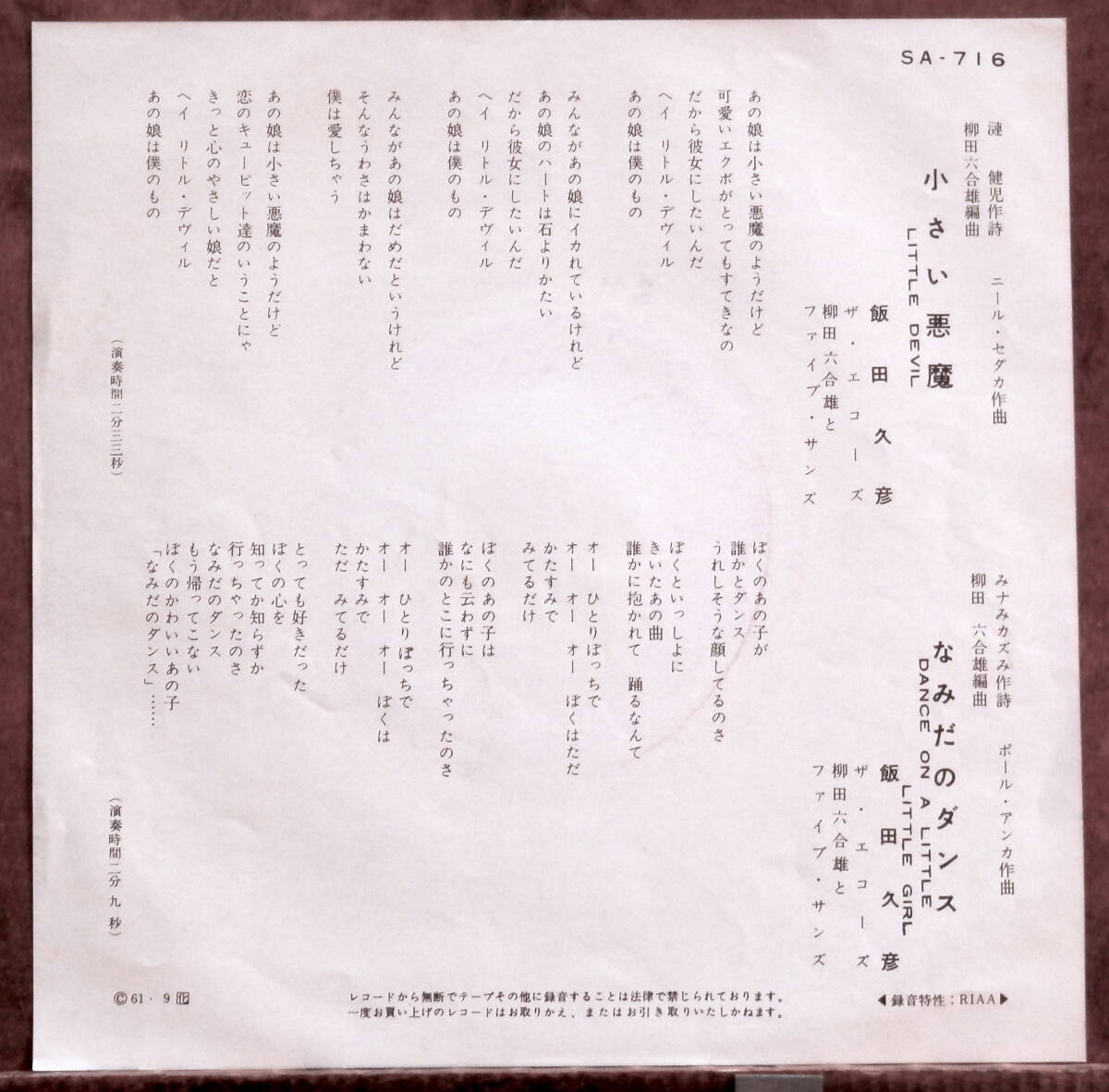 2511a 【Artist】飯田 久彦 /ザ・エコーズ #Hisahiko Iida A) 小さい悪魔 B) なみだのダンス 【Release/Label/Note】 1961 / SA-716 / コロムビア * ニール・セダカ カヴァー♪ 和オールディーズ 【Condition】 Jacket/Record:B/B (国内盤) ■■■ ■■■ ■■■ ■■■ ■■■ ■■■ ■■■ ■■■ 【状態・盤質 説明】 S・新品未開封など A・綺麗・キズ等も無く、痛みも薄い B・多少痛み・キズなど見られる C・痛み多・キズ多く痛み多 その他、+ - で補足しています。 *中古という事をご理解して頂ける方のご購入をお願い致します。 ■■■ ■■■ ■■■ ■■■ ■■■ ■■■ ■■■ ■■■ |
