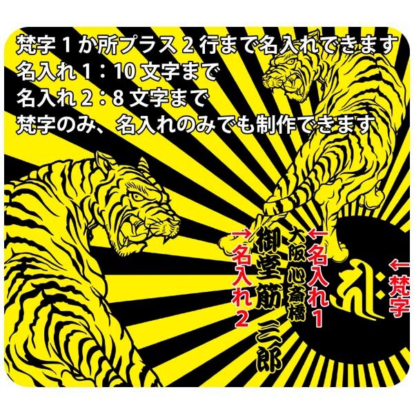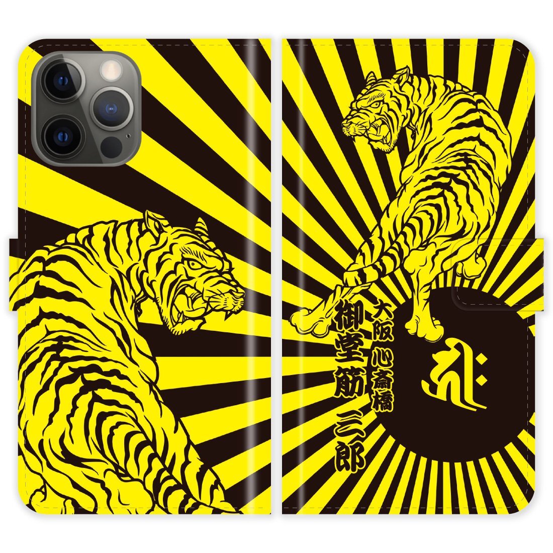 iPhone14 Pro Max docomo au softbank 対応、干支を表す梵字と虎と日章旗のデザインに名入れができる手帳型ケース
