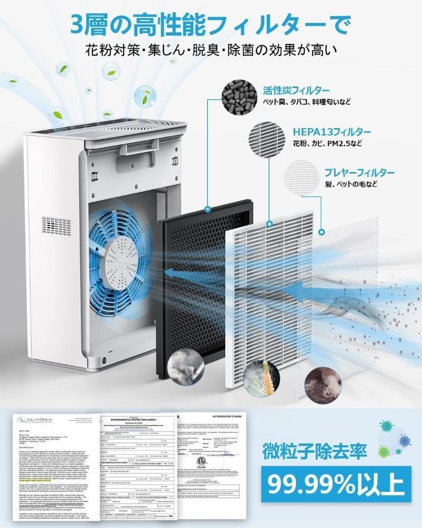 【自動空気質検知&自動モード搭載&花粉対策】①空気値の可視化のために、空気清浄機は、リアルタイムで空気質を検知する高精度空気質検知センサーが搭載しています。検知センサーにより、目に見えない浮遊や付着した微細粒子を感知し、いつでもお部屋の空気状態を検知できます。タッチパネルで空気質を一目で分かります。②自動モードを設定すると、自宅の空気質により、風量を自動的に「1-3階段」に調整されて運転し、高効率に汚れ空気を吸い込み、リアルHEPA13フィルターでホコリや花粉をしっかりと捕集して空気を清浄します。手動的に風量調整が必要なく、とても便利です。花粉季節に大活躍!花粉症の悩みから解放されましょう。