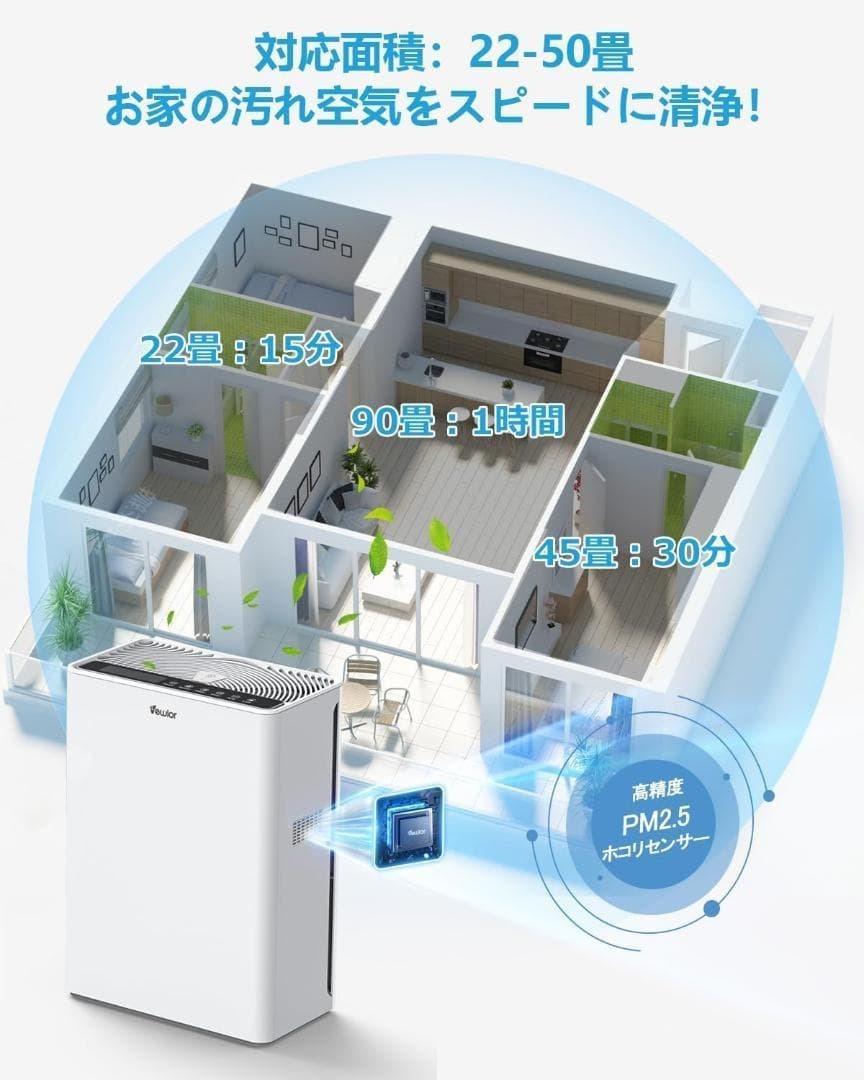 【50畳清浄&高性能HEPA13フィルター&アロマ対応】①vewior空気清浄機は1時間以内に、50畳までの部屋をカバーし、1時間あたり5倍の空気を清浄できます。普通の空気清浄機に比べて、リアルにお部屋の全体をカバーし空気清浄を行います。②高性能のHEPA13フィルターを採用し、大きなホコリやゴミを集める「プレフィルター」、細かい浮遊物質を集める「集じんフィルター」、50%活性炭を使った「脱臭フィルター」の3層構造で汚れた空気やニオイをパワフルで清浄し、微細粒子など有害物質を99.99%※除去し、キレイな空気を提供します。高性能除去機能とハイスピード清浄を両立する理想の空気清浄機です。交換用のフィルターも販売しています。交換用フィルターの検索コードはB0C1FXW62Wです。③空気清浄器はアロマ対応して、お好きなアロマオイルトップにあるパッドに入れたら、アロマディフューザーになります。