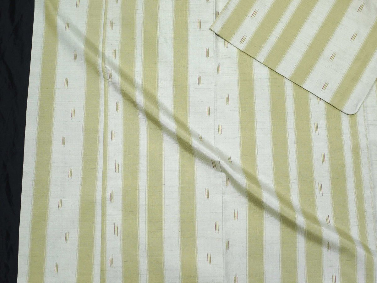 | 商品説明 | 「やまと」のお品物です。 梅幸茶(薄い黄緑味の茶色)と所々短い薄茶や柳茶、薄赤茶の筋を入れた淡い柳鼠を縞に織り出した、はんなりとした 雰囲気の紬のお召し物です。 とても上質の紬です。 茶色がかった緑暈しの八掛がついています。 胴裏はポリエステルが付いています。 ミシン仕立てです。 上品で洗練された色、柄行で、合わせる帯によって比較的幅広い年代の方にお召し頂けることと思います。 同時出品の 「《花小袖》名古屋帯 紬;型絵染 黒地 象と小鳥 椰子 パイナップルにイスラム風の塔 」を 合わせても、とても良く合うと思います。 |