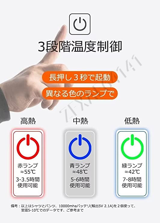 【材質】:ポリエステル、綿 【カラー】:ブラック,グレー ※注意:モバイルバッテリーが付いていないのでお客様はご自身でご用意ください。 バッテリー接続用USBケーブルが付属しています。5V/2AのUSB出力充電式モバイルバッテリーをオススメします。 ※サイズとカラー選択可能です、落札後、ご要望のサイズとカラーを提示くださいませ。 ※素人採寸の為、誤差が生じる場合がございます。ご了承下さいお願いします。 ※撮影時の照明やPC設定・環境により、色具合に差異がある場合がございます。 ※ 連続使用時間は目安です。外気温など使用状況により異なります。 三階段温度調節: ワンボタンで温度三段階までコントロールができますのでとても簡単便利です。 指示ライトボタンを押せば 強 中 弱の3段温度が設定できます。 ○生産により一部の製品のUSBケーブルは外部ポケットにあります。商品はランダムに発送されます。 洗濯ヒント: 1.モバイルバッテリーを取り出し、適度な洗剤を加えて洗ってください。 2.高温の水は使わないでください。 3.力強く揉んでないください。 4.洗濯した衣服は脱水、手で絞らないでください。換気の良い場所に置いてください。 最大洗濯水30°で手洗い限定(ねじれ/洗濯機/アイロン仕上げ/漂白剤など禁止です/洗濯する前に必ずバッテリーを取り外してください) 健康効果: 防寒&上下の伸縮性に優れたストレッチ素材で、動きやすく窮屈な締め付けがありません。汗や水分を素早く吸収・乾燥させて常に快適な状態を保ちます。超厚手生地でありながら、裏起毛で、もこもこした肌触りが気持ちよく、着た瞬間から暖かさを感じることができます。 寒い冬には一点を持ちますと冬将軍に怖くありません。血行を促進して湿気を追い出します。 赤外線発熱します。性能は安定であり、感電危険性ゼロ、放射問題なし、安心的にご利用ください。 |