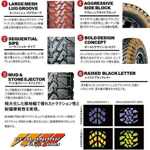 | タイヤ名 | YOKOHAMA GEOLANDAR MT G003 ※US開発の高性能マッドタイヤです!! 安心の国産製になります。 |