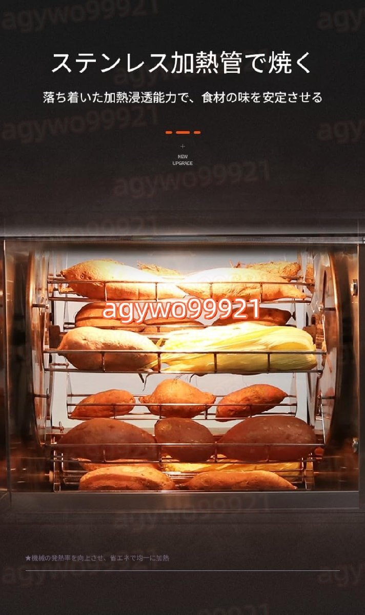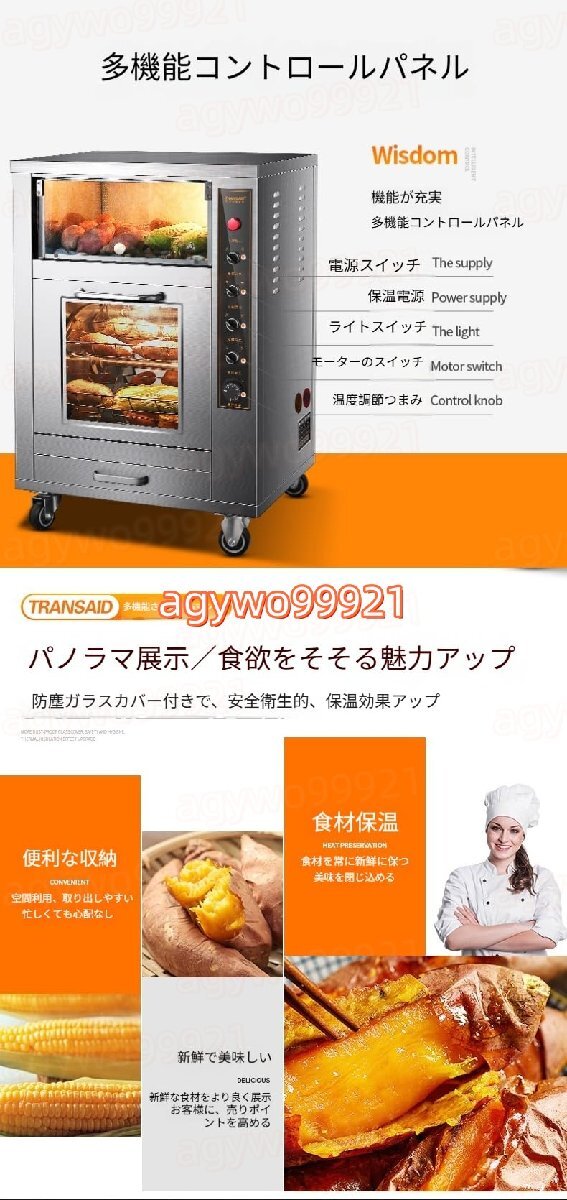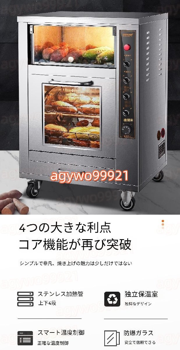 *様々な食材に対応、無限の美味しさ:** サツマイモ、トウモロコシ、ナシ、ジャガイモ、サトイモなど、様々な食材を同時にローストできるため、多様な味覚を満足させ、メニューを豊かにします。 # 業務用サツマイモロースター:大容量、多機能ローストで本格的なスモークの美味しさを堪能 この業務用サツマイモロースターは、サツマイモ、トウモロコシ、ナシ、ジャガイモなどのローストを効率よく、美味しく、安全に楽しめるプロ仕様のオーブンです。業務用の調理環境に最適です。 ## I. パワフルな構成、抜群のロースト能力 - **ステンレス製ヒーティングチューブ(4段階):** ステンレス製ヒーティングチューブを採用することで、安定した均一な加熱を実現。サツマイモやトウモロコシなどのローストに、均一な風味と優れた食感を与えます。また、加熱効率を高め、省エネにも貢献します。 - **インテリジェント温度制御システム:** 室温から250℃まで、温度を柔軟に調整できる精密な温度制御機能を備えています。トウモロコシとサトイモは200℃で20分、サツマイモとジャガイモは200℃で45分と、ロースト時間を簡単にコントロールでき、調理がよりスムーズになります。 - **独立断熱室 + 照明付きヒーター:** 独自の独立断熱設計と照明付きヒーターの組み合わせにより、食品の温度を長時間維持しながら、見た目も美しく仕上がります。サツマイモは甘くて風味豊か、トウモロコシはツヤツヤ、ジャガイモは柔らかくシャキシャキ、サトイモは忘れられない味で、お客様の心を掴みます。 - **防爆ガラスドア:** 安全で信頼性の高い防爆ガラス素材により、焼き上がりの様子を容易に観察できるだけでなく、商業施設における操作安全性も確保します。 ## II.大容量で業務効率を最大化:多層グリル設計により、サツマイモ、トウモロコシ、ナシ、ジャガイモなどの食材を大量に同時に焼き上げることができ、商店街、夜市、コンビニエンスストアなど、人通りの多い商業施設のニーズに応えます。1回の焼き上げで多くのお客様に提供できるため、業務効率が向上します。 人気のサツマイモ焼き屋台を路上に出店したい場合でも、レストランにこだわりの焼き芋製品を加えたい場合でも、この業務用サツマイモ焼き機は、プロ仕様の焙煎性能、豊富な機能、そして大容量を備えており、本格的な焙煎の風味でお客様の味覚を魅了し、美味しい収益を生み出す事業を始めるお手伝いをします。