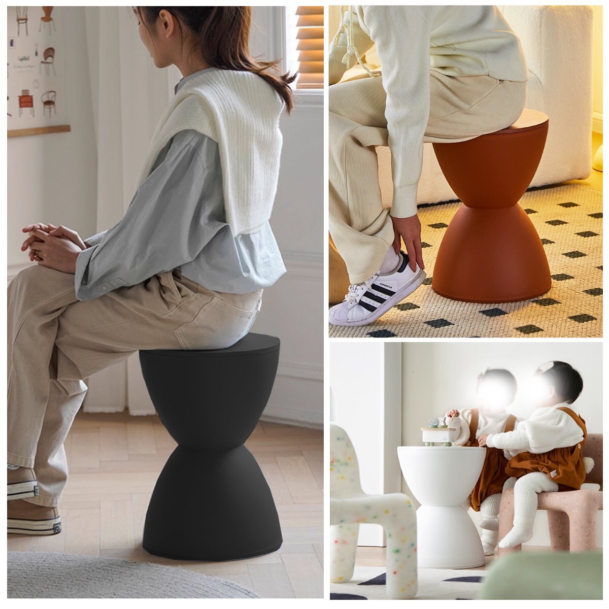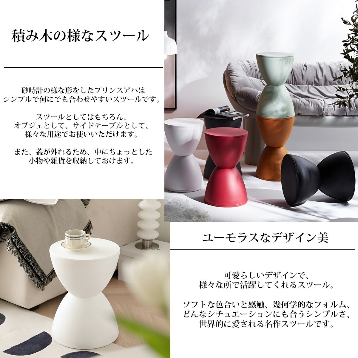 ![]() 積み木のようにカラフルなスツール 砂時計のような形をしたプリンスアハはシンプルで何にでも合わせやすいスツールです。 スツールとしてはもちろん、オブジェとして、サイドテーブルとして、様々な用途でお使いいただけます。 また、蓋が外れるので中にちょっとした小物や雑貨を収納しておくことができます。 スツールですが、小ぶりなサイドテーブルとしてもピッタリなサイズ感。 軽量設計で、女性も片手で軽く持ち運びしやすいのも魅力。 小さく可愛らしいサイズ感ですが、大人の男性が座っても安定感はバッチリ。 リビング、玄関先や洗面スペース…、色んな場所で大活躍! プリンスアハは色々なところで活躍してくれる使い勝手の良さも人気の秘密。 リビングでサイドテーブル代わりに使ったり、観葉植物を置く台として使ったり。 玄関先にひとつあると、 靴を履く時や、手荷物をちょっと置く場所としても重宝します。 洗面室に置いて、ドライヤー中やスキンケア中に腰かけたりするのにも便利です。 プリンスアハはKartellでも多くのアイテムを手がけている、 フィリップ・スタルクのデザインです。 スタルクの革新的で見る者をうっとりさせる造形美が光る一作になっております。 ■商品仕様 サイズ(約):幅30×奥行30×高さ44cm 素材:PP製 重量(約):1.7kg デザイナー:Philippe Starck/フィリップ・スタルク |