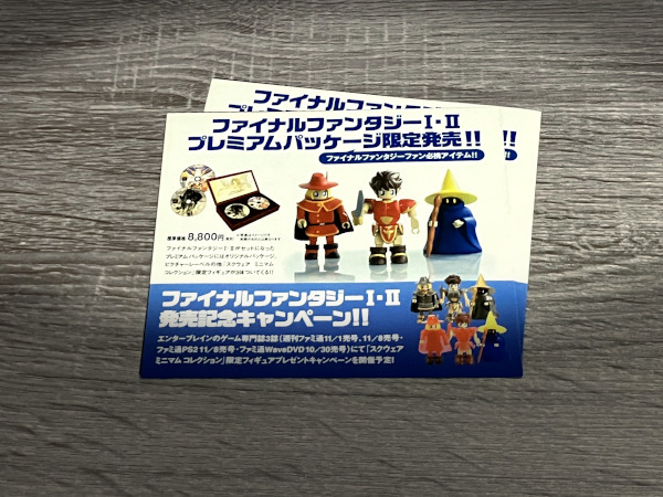 | ------------------------------------------------------------------------ ж ж ж 商品について ж ж ж ------------------------------------------------------------------------ ◆ 「 PS ファイナルファンタジーⅠ・Ⅱ プレミアムパッケージ / 二つ折りチラシ 」 X 同じもの 2部 サイズ : ( 画像1枚目の状態で ) 12.5センチくらい × 14.2センチくらい シワ、折れ、などある場合があります。 入手より かなり経年しており、 初期、経年 による劣化、及び 保管時、取り扱い時などのダメージ必至です。 ※ 商品は 画像1枚目のもので全てです。 ※ 自身が 当時 新品で入手した ワンオーナー品です。 ※ 画像は 実物よりきれいに写ってしまう部分があります。 また、最初の検品・出品から 時間が経っているものは、掲載画像・説明にはない 劣化 及び ダメージの増加 など 必至です。商品状態は現物優先です。 ※ 複数在庫がある場合は、お手元に届きますのは 同じ仕様・同じ程度の商品でも 画像と 同一個体ではない場合があります。 ※ ペットなし、非喫煙環境です。 |