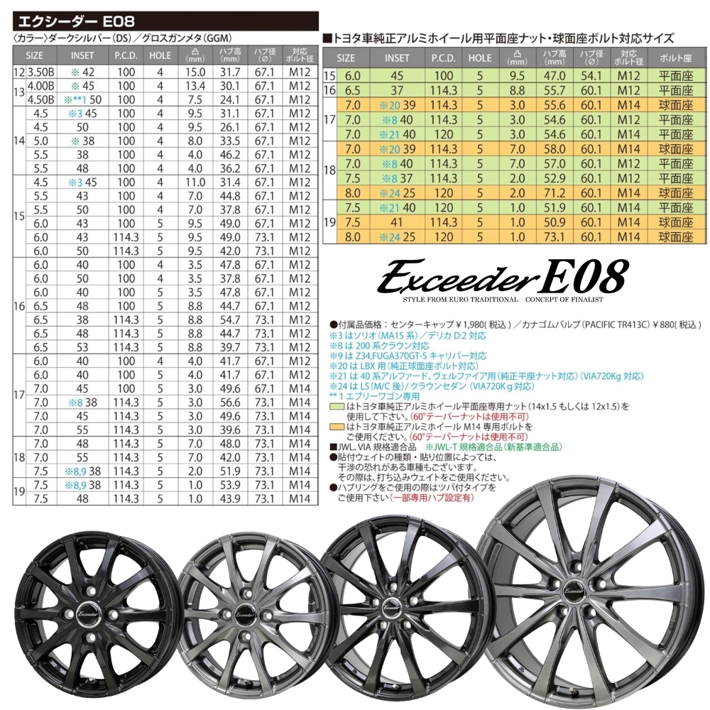 | 備考・注意点 | JWL VIA規格適合品 ナットは付属しておりません。 ●適合車種について ●装着可能車種はあくまでご参考です、上記車種にても年式・グレード等により装着できない場合がございます。 不明な点等ございましたらお問い合わせください。 |