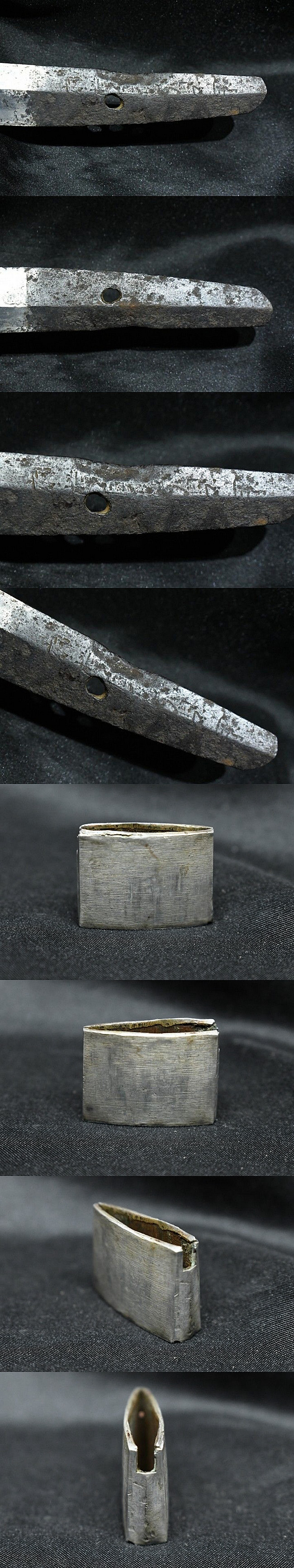 表【相模国住貞宗】 裏【-】 種別:わきざし サイズ:長さ 39.6cm 反り: 0.3cm 目くぎ穴 1個 元幅:約2.786 cm 元重:約 0.594cm 先幅:約 1.866cm 先重:約 0.473cm 刀身重量:約 298.3g(ハバキ・柄をとった状態) ハバキ重量:約 20g 鞘全長:約 62.7cm |