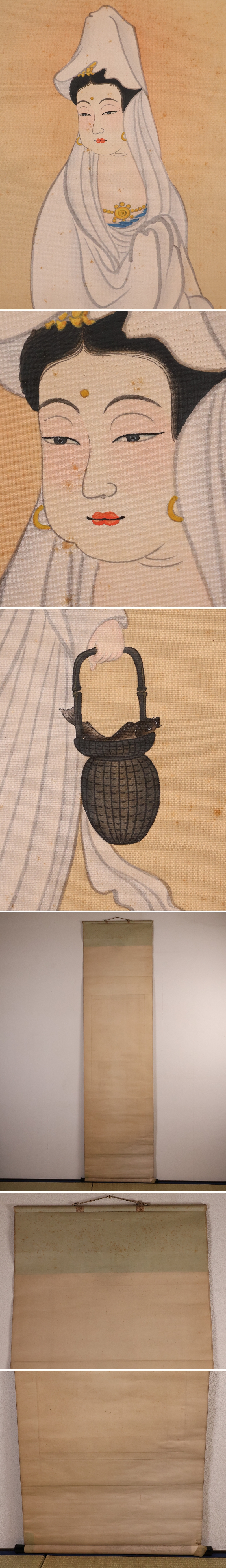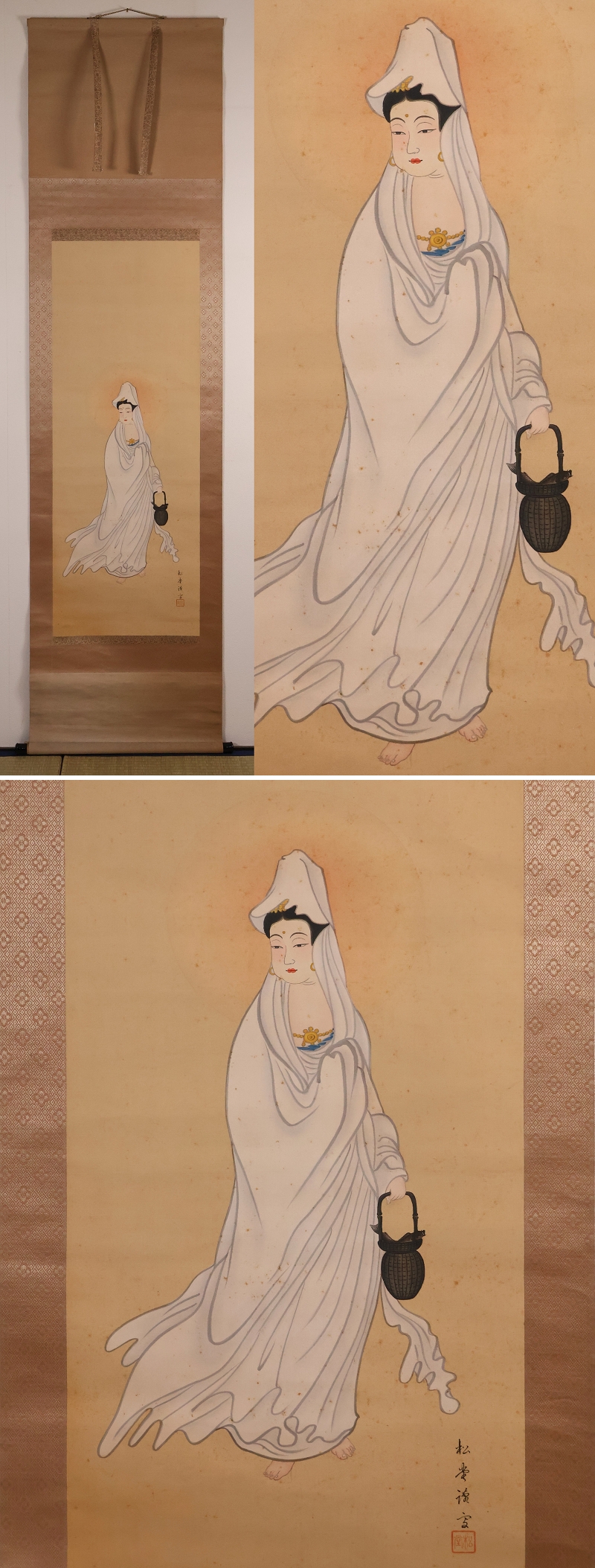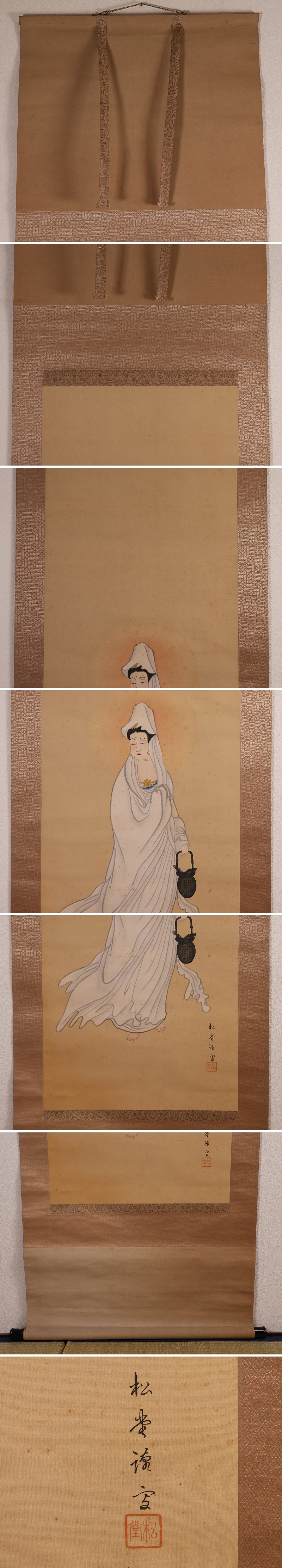 ◇【模写】日本画 魚籃観音像 在銘 松堂 絹本 掛軸 木箱入り 仏画 仏教美術 MB233◇