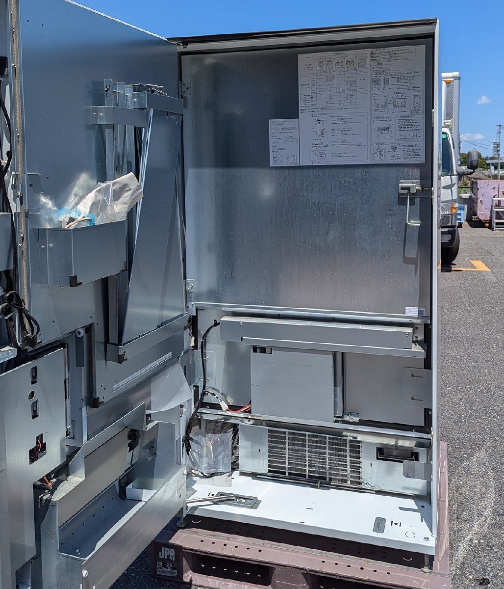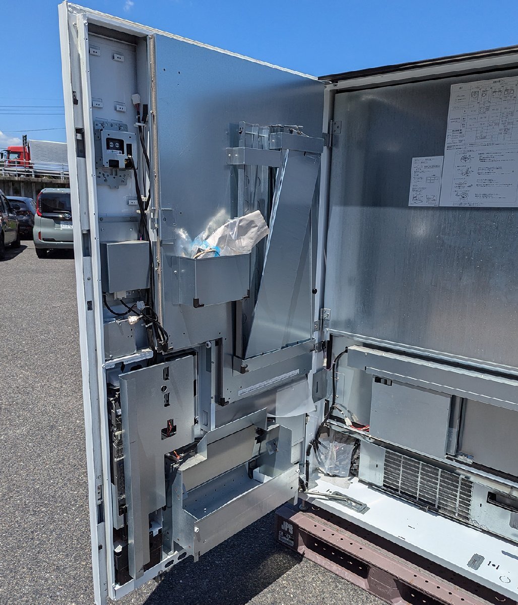 | ご覧いただきありがとうございます。 ※本商品は、営業所止め発送のお品です。 営業所からの運搬など、手配可能な方でご入札ください。 ■メーカー サンデン・リテールシステム ■モデル名 FIV-2110N ■商品状態 清掃、冷凍機能(庫内温度の低下)の動作確認を行っております。 ラッピングは可能な限り剥がしておりますが、縁などに施工されたシーラーが取り切れておりません。 また、巻き込みで貼られている箇所など、一部は剥がせておりません。 ※以下につきましては、落札者様にてご対応をお願い致します。 中身を準備できませんので商品の排出動作は確認しておりません。 先日まで使用されていたため、問題はないかと思いますが 調整などが必要な場合はご対応をお願い致します。 紙幣は旧紙幣のみの対応です。 新紙幣への対応は、ご対応お願い致します。 キャッシュレスの端末も起動確認は確認しておりますが 使用には契約など必要になります。 使用される場合はご対応ください。 アンカー等、固定金具類はございません。 ■詳細 製造 2022年 電源 100V 公称サイズ W103cm D83.3cm H183cm 重量 290kg 詳しい内容はメーカーホームページをご確認ください。 ■発送 福山通運、営業所止め720サイズで発送になります。 | ||