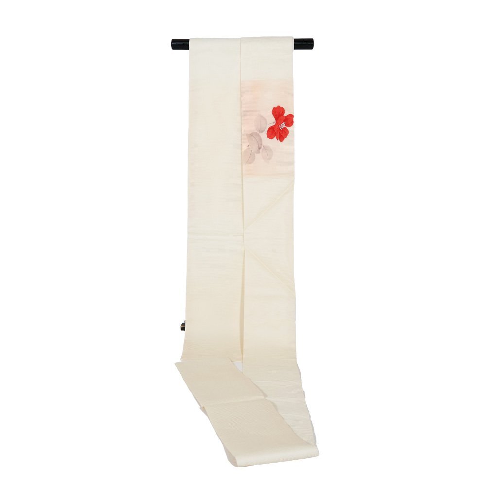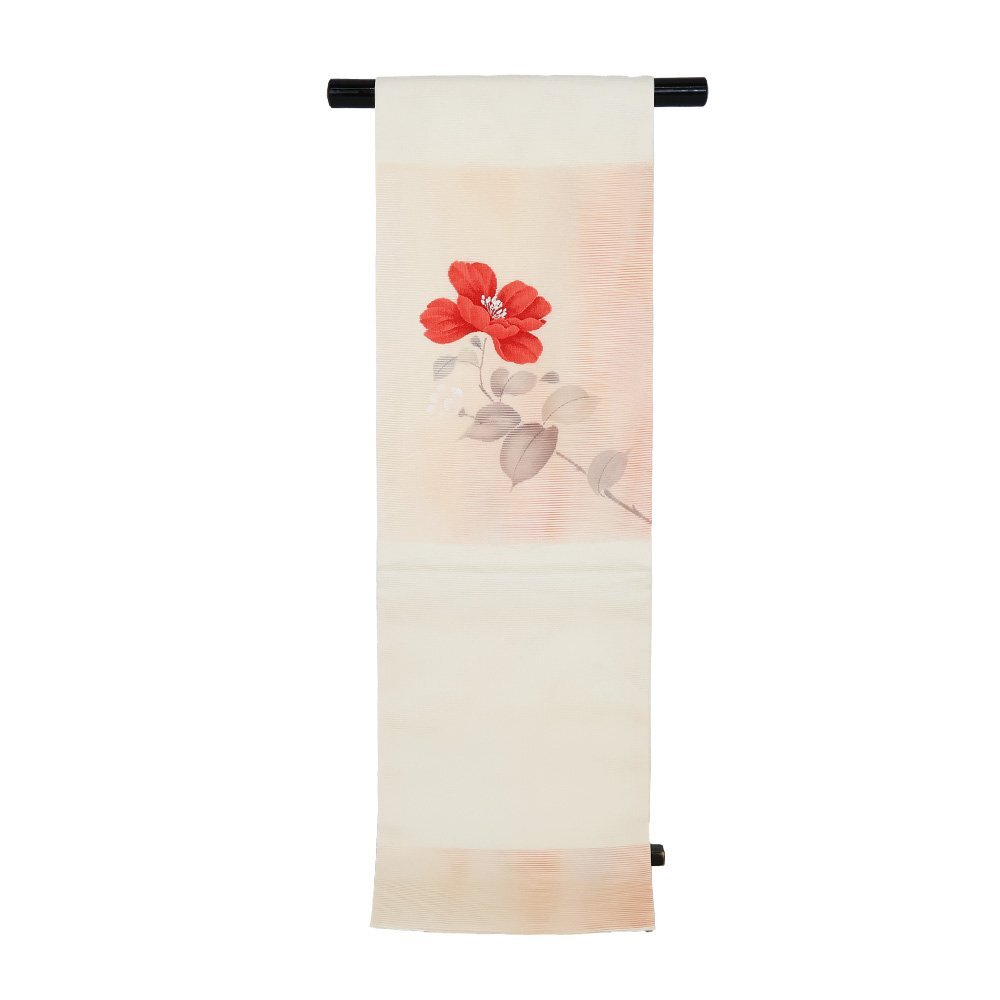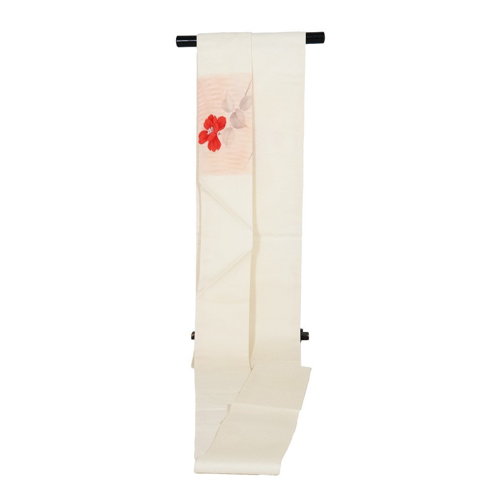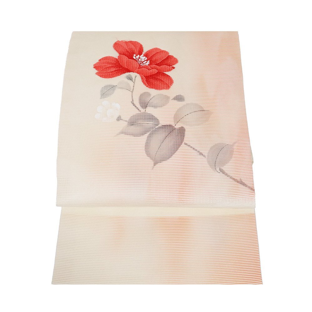 | 絽 名古屋帯 夏帯 クリーム・サーモンピンク暈し地 縫い取り花柄 未使用品 仕立て上がり | |