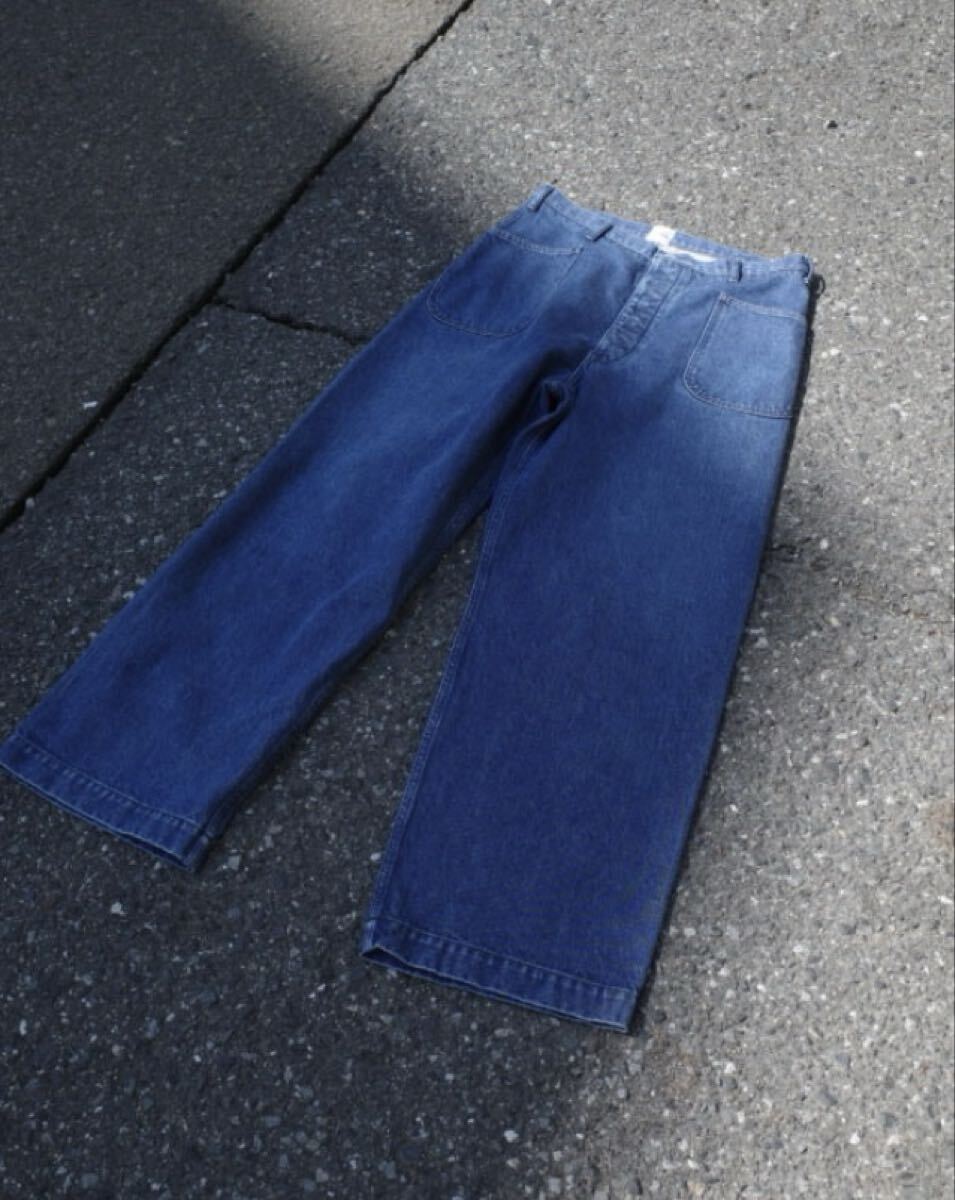 river aoyama 別注 bisown usn denim です。色はサンドブルー。サイズは5。ウエスト85センチ股上33センチ股下76センチワタリ幅34センチ裾幅26センチ。新品です。