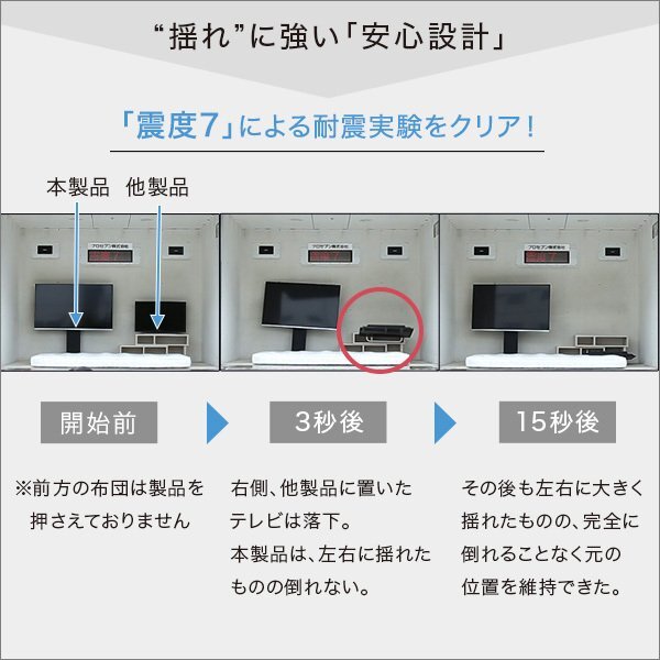 | 【ポイント】 ①取付けテレビは32~60インチまで対応可能です。 ②配線や電源タップを背面に収納でき、見た目が綺麗でスッキリ! ③震度7の耐震試験をクリアしました。 |