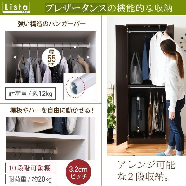 【カラー】 ダークブラウン、ホワイト 【サイズ】 <外寸> 幅59.5×奥行53.5×高さ180cm <内寸> 扉内:幅55×奥行48×高さ166cm 上段ハンガーバー:幅54.5×高さ(可動棚最上段)68.5~(可動棚最下段)97.5cm 下段ハンガーバー:幅54.5×高さ(可動棚最上段)80~(可動棚最下段)54.5cm(3.2cmピッチ10穴) 可動棚:幅55.5×奥行47.5×厚み1.7cm(3.2cmピッチ10穴) 【材質】 本体:プリント紙化粧合板 【耐荷重】 ハンガーバー:(約)12kg以下 可動棚:(約)20kg以下 【ハンガーバー収納量】 衣類:(約)20~36着 【生産国】 ベトナム 【梱包】2梱包でお届けします。 2-1 サイズ:66×60×14cm、重量:20.6kg 2-2 サイズ:93×33×10cm、重量:15.2kg 【その他】 ・可動棚:1枚 ・六角レンチ同梱 【組み立て品】 お客様による組み立てが必要です。 【ご注意】 ・サイズ、重量は概算です。 ・商品カラーはご使用のモニターによって実際の明るさや色と異なって見える場合がございます。 |