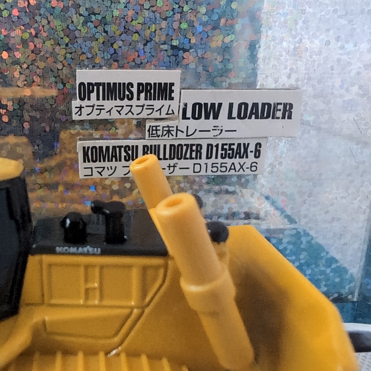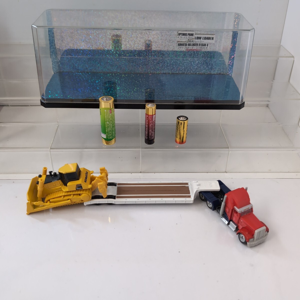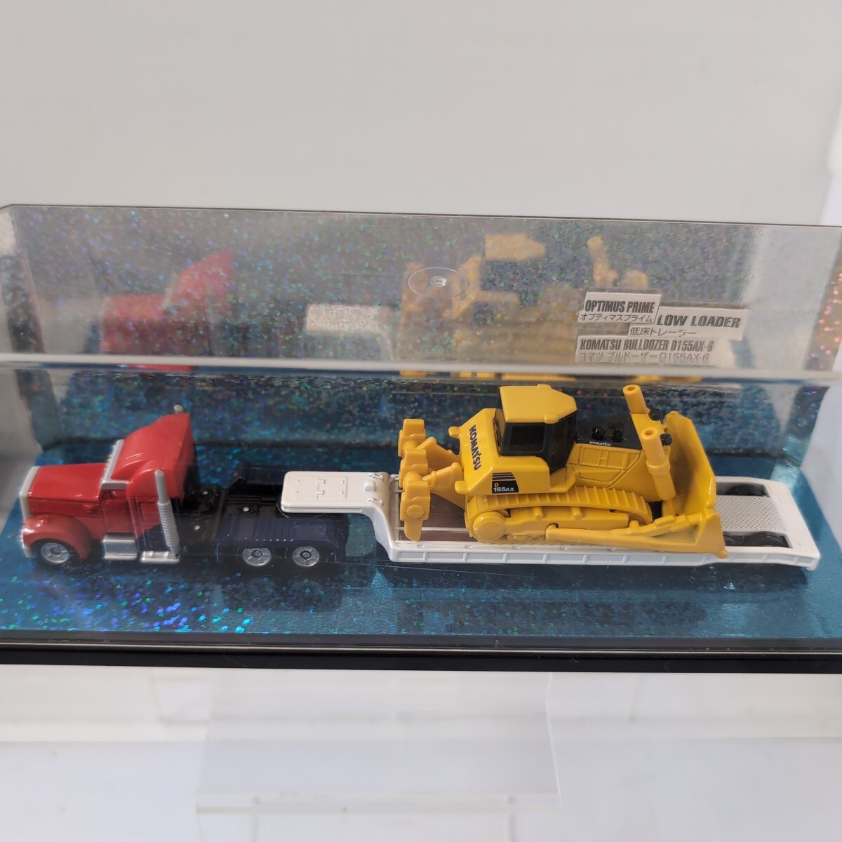 トランスフォーマー(オプティマス・プライム)ドリームトミカと、低床トレーラーと、コマツ ブルドーザー D155AX-Gとを、コラボしてもらいました。発売当初に、箱から出して、ケースに、収めました。(外箱などは有りません)。画像の物が、全てです。ご希望の方は、画像に写っている、ケースと、同梱いたします。 TRANSFORMER(Optimus Primal)(Convoy)(Optimus Prime)DREAM TOMICA low-bed trailer & KOMATSU BULLDOZER D155 AX-G 。