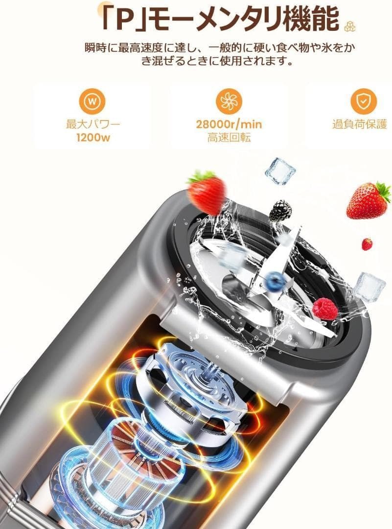 強い粉砕力が自慢!耐久性にも優れています。新開発の6枚刃カッターを搭載し、野菜や果物の繊維をより細かく切削できるのでなめらかな舌触りを得ます。S字型ブレードは食材を巻き込むから均一に仕上げることができます。毎分約28万回の高速運転で、野菜や果物を使ったスムージーやジュース、ミルクシェイクなどが短時間に作れ、ジューサー、ミキサーはこれ1台あると調理の幅がより広がります。2つのボトルを付属して、最大650mlの容量で一回で1-3人分の物を調理できます。一人暮らしも、家族用のジュースの準備も、楽々に出来上がります。握りやすいデザインのボトル、そのままで直接に飲むも楽です。外出先や、通勤先に持ち運びにもとても便利です。