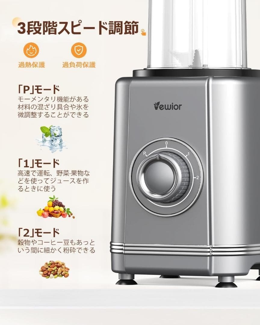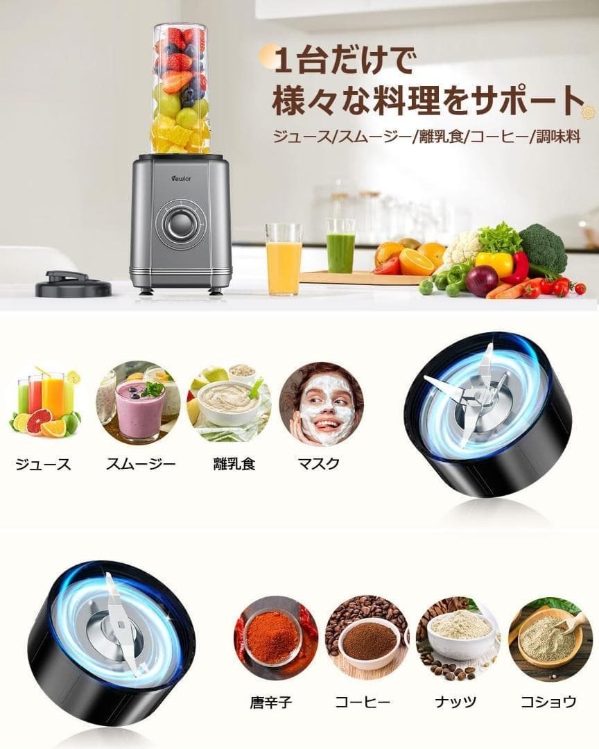 ジューサー ミキサー 1台多役ミキサー・28000r/min 高速回転 650ML大容量】VEWIOR 氷も砕ける スムージー/野菜/果物/ジュース/コーヒーミル/離乳食用 3段階モード調