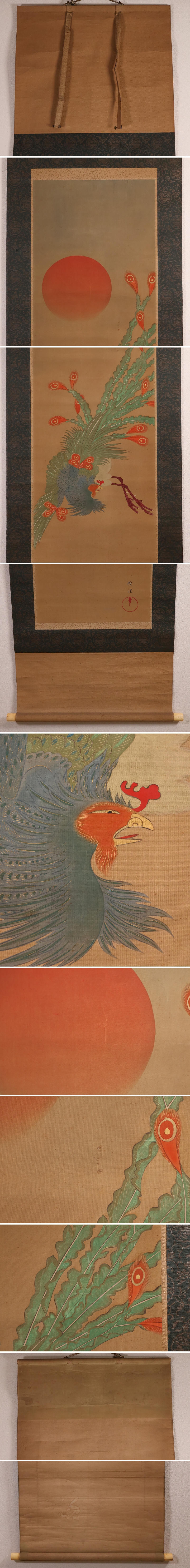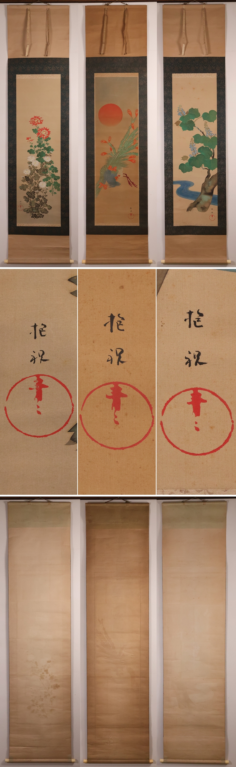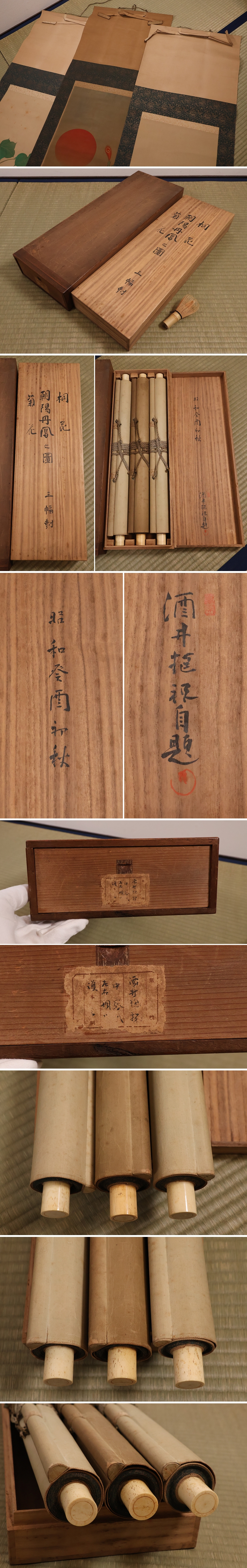 ◇【模写】酒井抱祝 朝陽丹鳳図 桐菊花 三幅対 絹本 掛軸 二重箱 昭和癸酉初秋 明治琳派 雨華庵5世 日本画 鳳凰 MB236◇