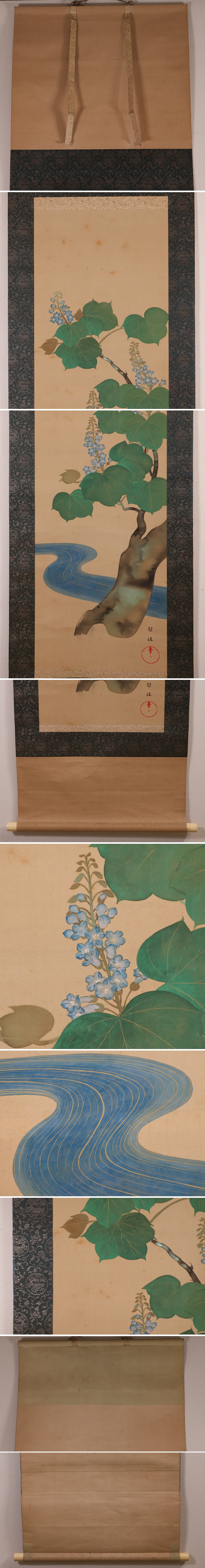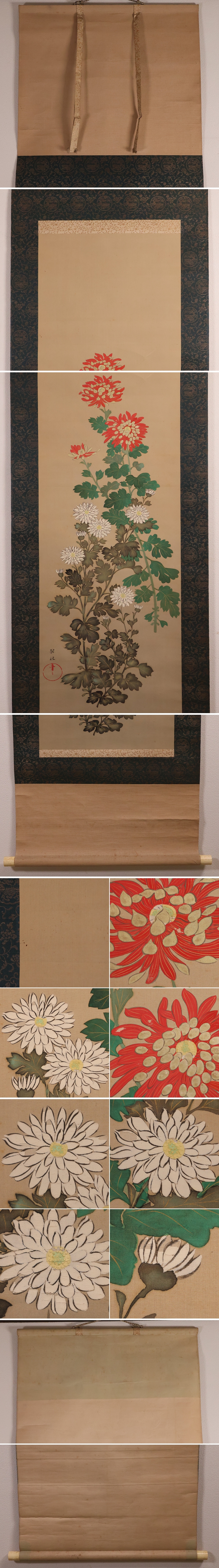変色・しみ・ヨゴレ・キズ・しわ・表装の亀裂・菊花顔料の剥落等、経年劣化あり