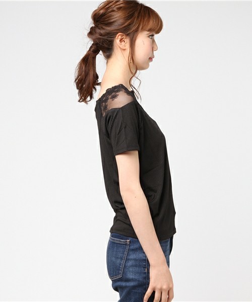 | ★新品タグなし!襟レース薄手リブカットソー黒系サイズF/透け感★ | ||||