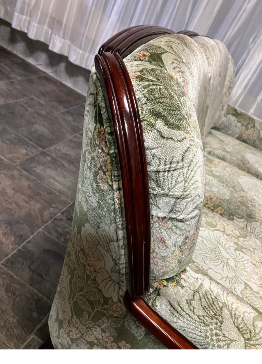 立体感のあるどっしりした背もたれに、渦巻き模様の彫刻を施した飾り木をあしらいました。