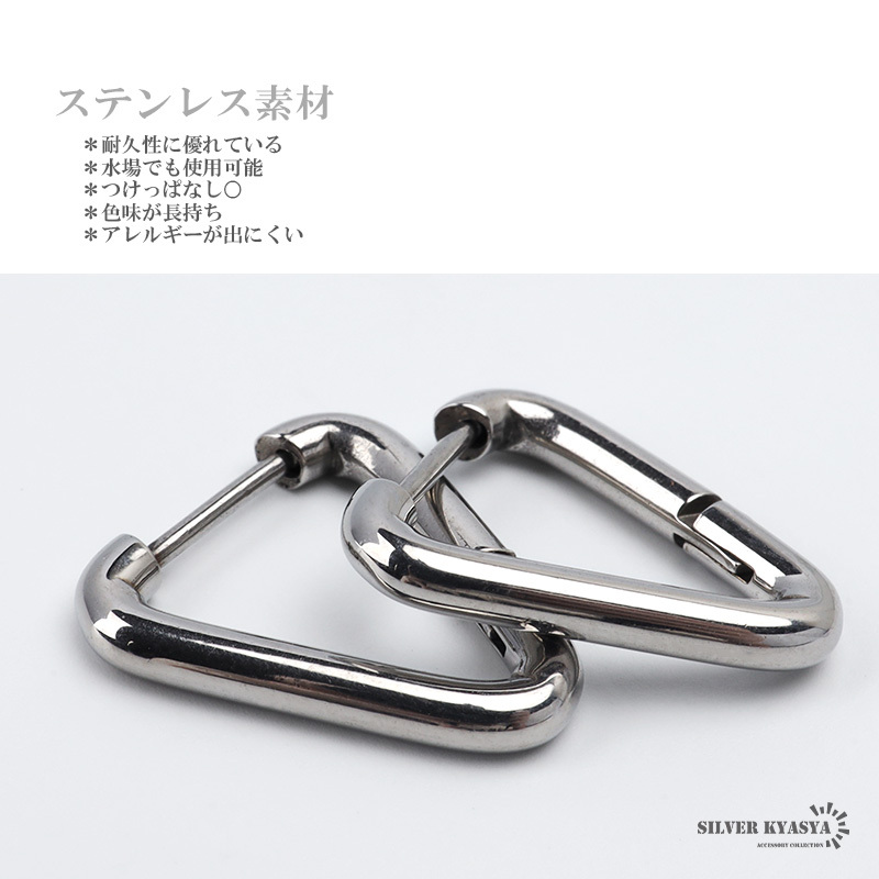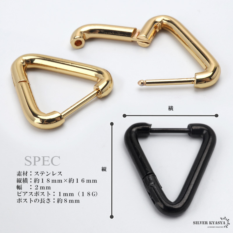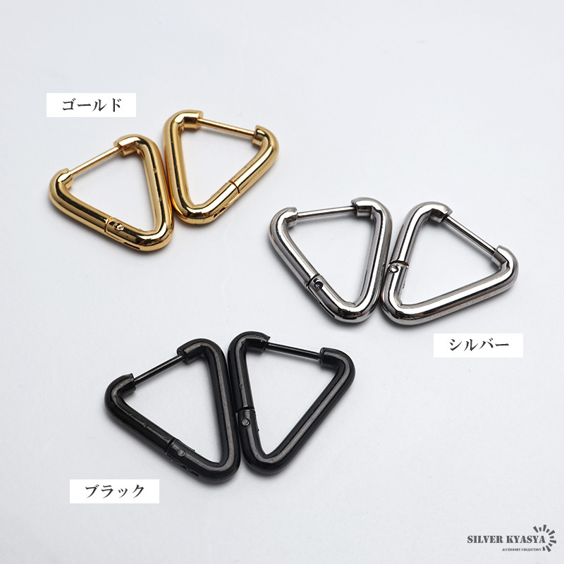 ※こちらの商品は【カラー:ゴールド】です。別タイプは別商品ページにてお買い求めください。| 商品概要 | ■ITEM DETAIL メタリックな質感がお洒落なトライアングルフープピアス。装飾のないシンプルなデザインで普段使いしやすいアイテム。 ■ステンレス素材を使用 金属部分は頑丈なことで知られるステンレス素材を採用。耐久性はもちろん耐水性も高く水場での着用も可能。金属アレルギーも出にくいとされている金属です。 |