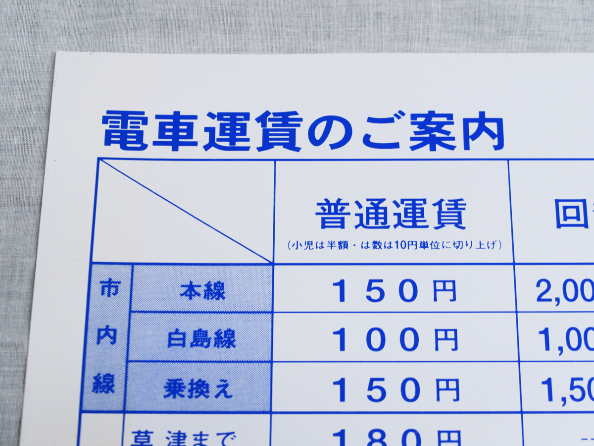 の出品です。 画像で確認出来る中古感があります。 当方では軽く水拭きした程度の清掃です。 同時出品している普通運賃表と一緒に保管されていて、料金も同じなので平成9年頃の品物だと思います。 画像をよくご確認して、ご入札ください。 ご不明な点がありましたら、質問欄よりお気軽にご連絡ください。 他にも出品していますので、よろしければこちらからご覧ください。 |