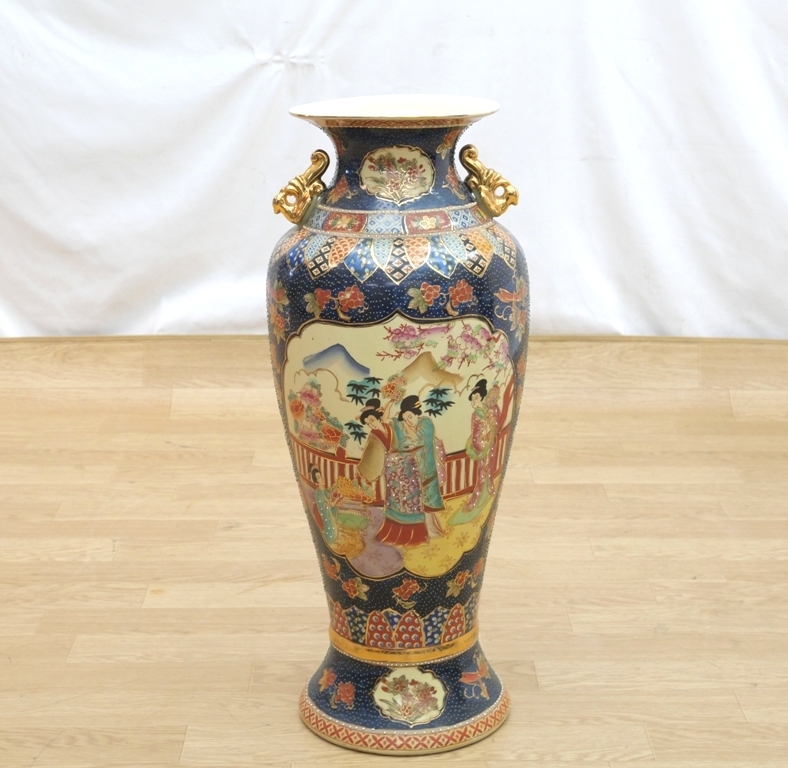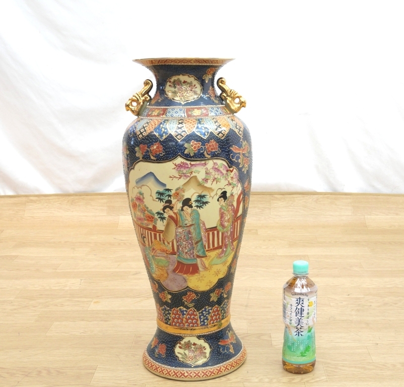 【インテリア用品】 中国 潮州 大 花瓶 陶器 双耳 高さ約61cm 大型飾り壷 花器 金襴手武者美人絵 騎馬兵 装飾品置物 |