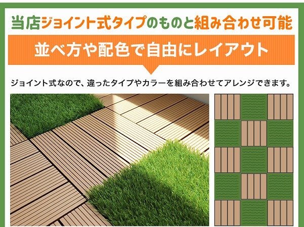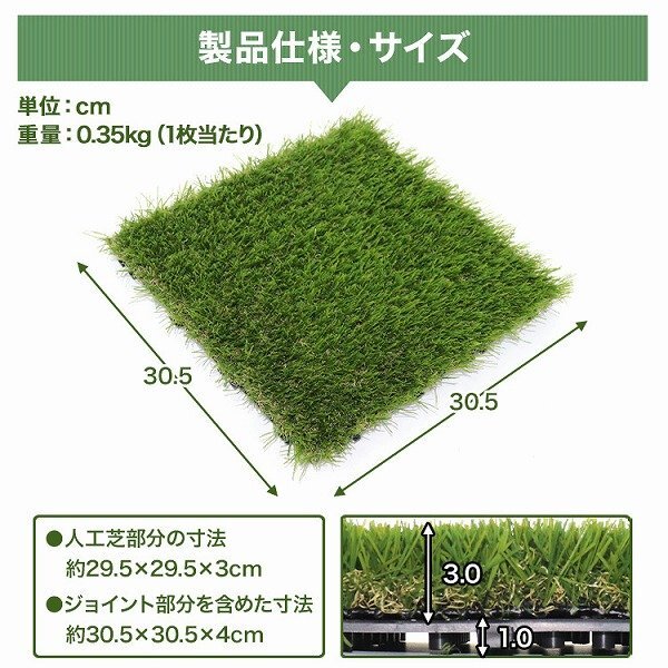 ジョイント式で簡単設置! 複数の葉をミックスしているからリアルな質感! 水はけもバッチリでお手入れも簡単! 屋外用の照明やイルミネーションなどの配線を裏面の隙間に通すことも可能です。 園芸用のハサミでカットできるので自由に配置も可能です。 大切なお庭やバルコニーのアレンジにぜひお役立てください♪ ■ 商 品 詳 細 内容 人工芝パネル ×27枚 サイズ 人工芝部分の寸法:(約)幅29.5cm×長さ29.5cm×高さ3cm ジョイント部分を含めた寸法:(約)幅30.5cm×長さ30.5cm×高さ4cm 重量 1枚あたり:(約)0.35kg 適用箇所 屋外(テラス、バルコニー、庭等) 保証期間 7日間 ※商品到着後7日以内の初期不良・破損のみご対応させていただきます。 注意事項 ・海外製品のため多少の傷、汚れがある場合がございますがご了承ください。 ・商品は、モニターによって色合いが異なって見える場合があります。 ・仕様・デザインは改良のため予告なく変更することがあります。 商品コード:ACE005SA |