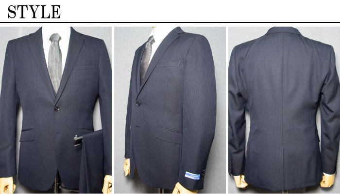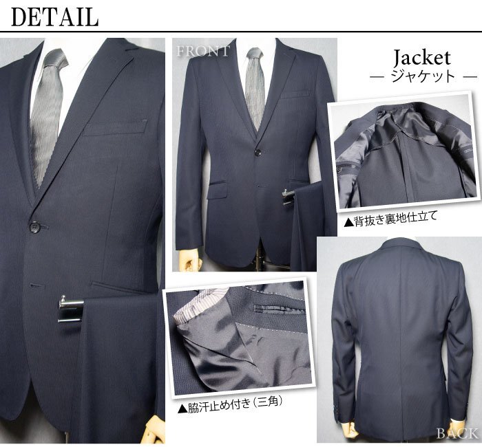| ジャケット | シングル2ボタン 細めノッチドラペル 背抜き裏地 センターベント 袖3ボタン ボタンクロス留め 開き見せ仕様 ピンポイントステッチ AMFステッチ Dカン 汗止め付き お台場仕立て スラントポケット |