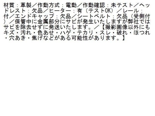 | 商品情報 | 材質:革製/作動方式:電動/作動確認:未テスト/ヘッドレスト:欠品/ヒーター:有(テストOK)/レール:付/エンドキャップ:欠品/シートベルト:欠品(受側付)/保管中に金属部分にサビが発生いたしますが弊社ではサビを除去せずに発送いたします。/【撮影画像以外にもキズ・汚れ・色あせ・ハゲ・テカリ・スレ・破れ・ほつれ・穴あき・焦げなどがある可能性があります。】 | ||