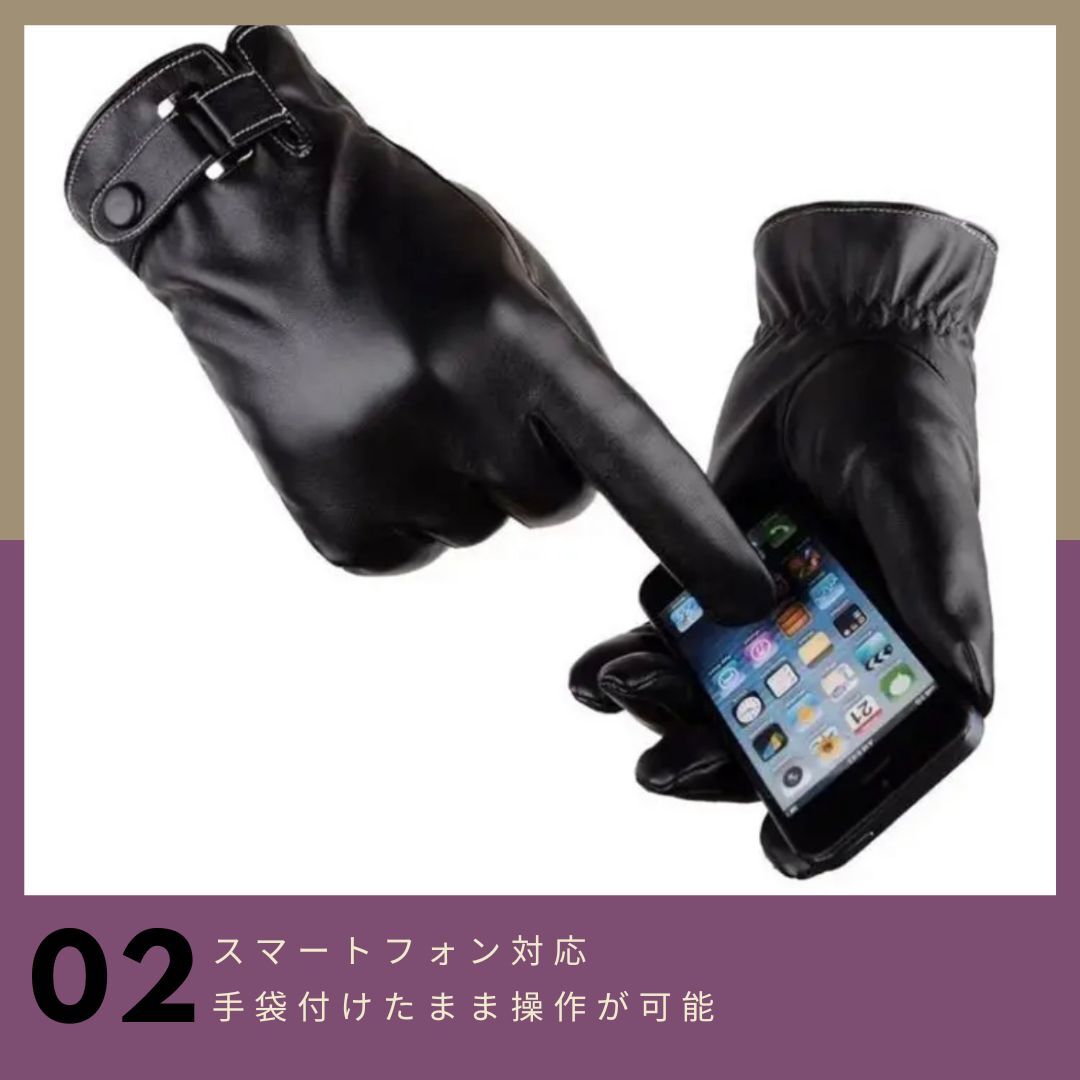 【スマホ対応・革手袋】商品情報サイズ全長23cm手囲い 22cm中指 9cm重量両手合わせて90g生地裏起毛性能撥水スマートフォン対応この冬、春大活躍のアイテム一度付けたらやめられない!【カラー】商品画像1枚目、タイトルをご確認ください。【合成皮革、全指タッチ操作対応手袋】合成皮革で高級感漂う男性用グローブで大人気の商品です。男性用手袋全てのスマホ、タブレット、カーナビ、ATMなどのタッチパネルに高感度対応しております。(全指タッチパネル対応の優れものです)PUレザー製なので高級感があり、水にも強くお手入れは簡単です。内側は毛布のような肌触りで気持ちよく、そして暖かい仕様となっております。【あらゆる場面で活躍】シンプルで落ち着いたデザインなので、日常・ビジネスシーンどちらでもご使用いただけます。また雨にも強いので自転車やバイクの運転時にも重宝します。イルミネーション 旅行 外出 アウトドア 山登り 釣り だけでなく車の運転にもおすすめです。通気性・保湿性にもこだわった男性専用手袋です。スマートフォン(アイフォンやアンドロイド)に対応しておりますので大変便利です。バイクに乗る方や、スーツなどの正装にもバッチリ合います。【注意事項】・送料の都合上箱なし、簡易包装での発送となります。・海外製品の為、多少の傷や汚れ等ある場合がございます。関連ワードバイク 自転車 サイクリング スポーツ スキー ランニング ジョギング ウォーキング 登山 ハイキングキャンプ ピクニック アウトドア 旅行 通勤 通学 室外作業 お釣り 防寒対策 メンズ レディース プレゼントギフト クリスマス 誕生日 記念日 お歳暮