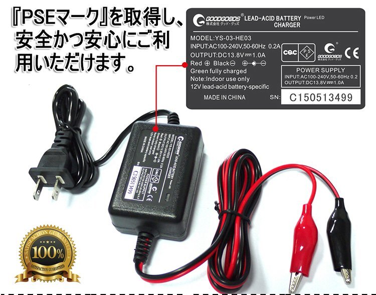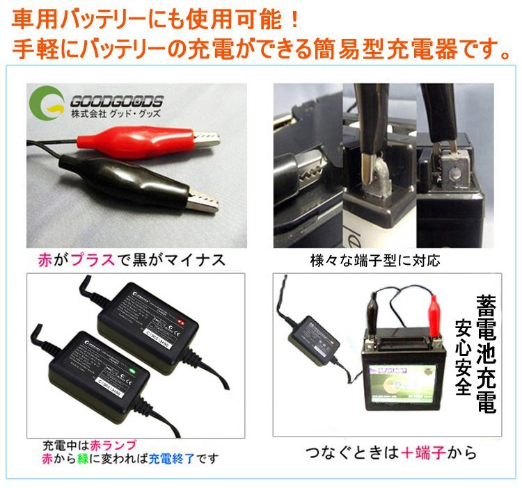 ★オススメポイント★ ■充電対応タイプ 12Vバッテリー密閉型、開放型、シールド型の全てのタイプで使用できます。 ※過度なバッテリー切れ等により、6.8V以下に下がったバッテリーには、充電ができません。ご注意ください ■充電手順 1.充電クリップの極性に注意してバッテリーに接続してください。 赤色クリップ(+)→バッテリー(+)端子へ 黒色クリップ(-)→バッテリー(-)端子へ 2.電源プラグをコンセント(AC100V)にしっかり差し込みます。 充電中は赤ランプが点灯します。 充電完了時は緑ランプが点灯します。 3.充電完了後、電源プラグをコンセントより抜きます。 4.次の順序で充電器のクリップをバッテリーから取り外し終了です。 黒色クリップ(-) 赤色クリップ(+) 注意事項 ※-----家庭用100Vコンセントから手軽に充電OK ※手軽にバッテリーの充電ができる簡易型充電器です。 ※小型バッテリーから大型バッテリーまでご使用いただけます。 ※最初は赤ランプが点灯で充電完了すると緑ランプに変わります。 ※当方からは使用法に関するサポートは一切できません。 ※稀に最初から緑ランプが点灯することがありますがその場合は接続しなおしてください。 ※仕様は予告無く変更になる場合がございます。 |