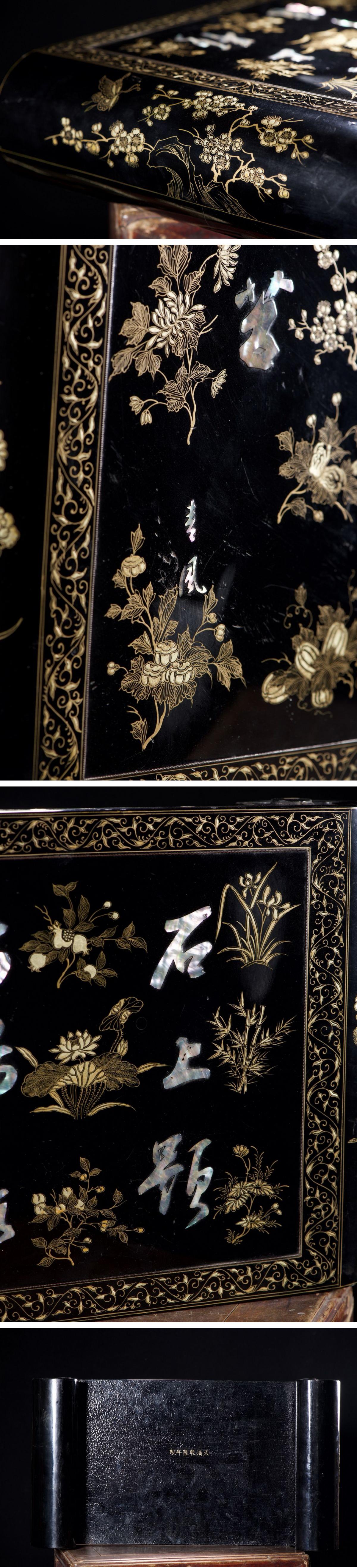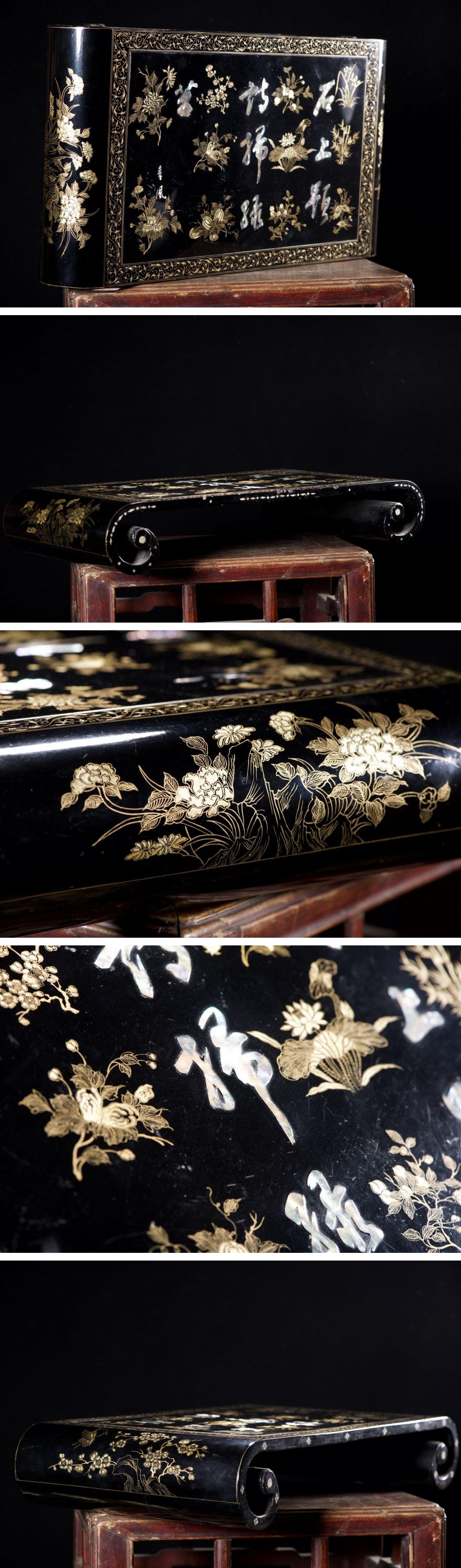【雲錦】1円から 清時代 木胎 金蒔絵 螺鈿象嵌漢詩花卉文茶台 大名道具 材質保証 時代物保証 古美術 骨董品8L21-12S6
