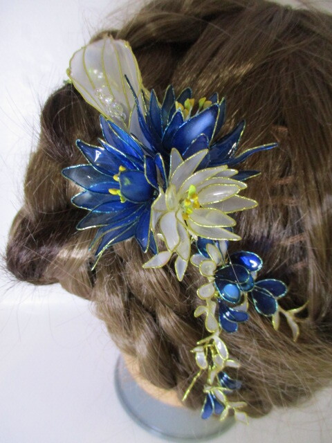 青 新品 未使用 髪飾り ヘアーアクセサリー 蝶 ディップフラワー 造花 小花
