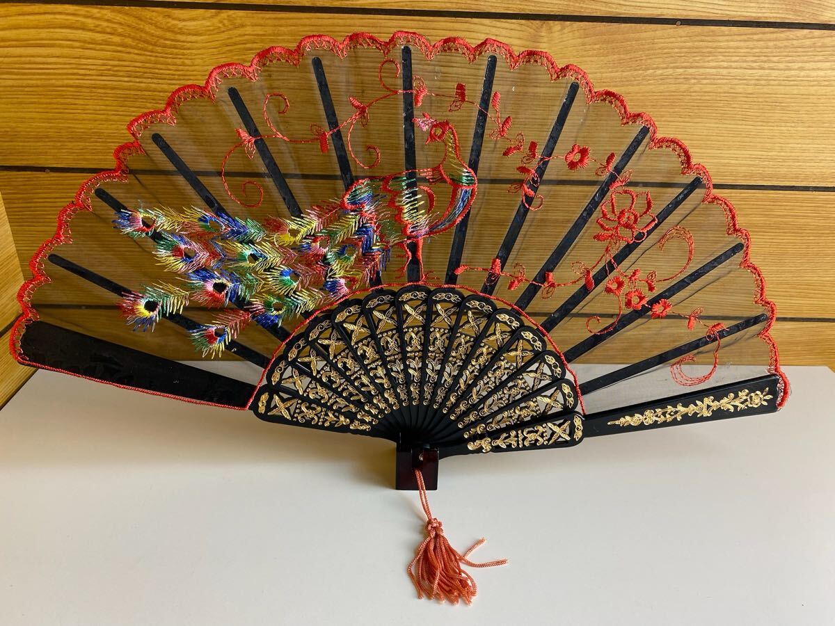 美品! 台湾 扇子 孔雀 布製 14cm 扇子立て付き