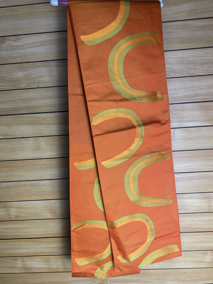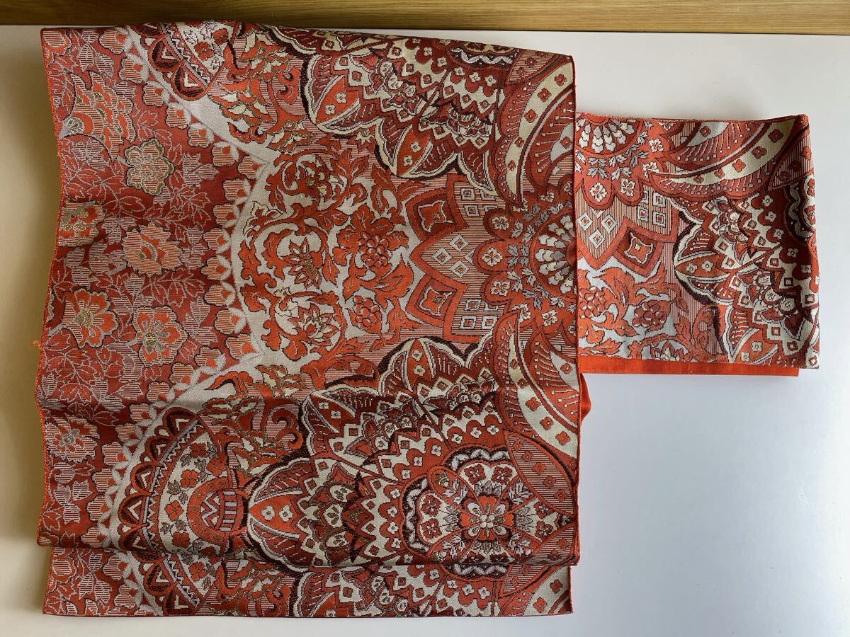 美品! 正絹 袋帯 六通柄 430cm 朱色 帯