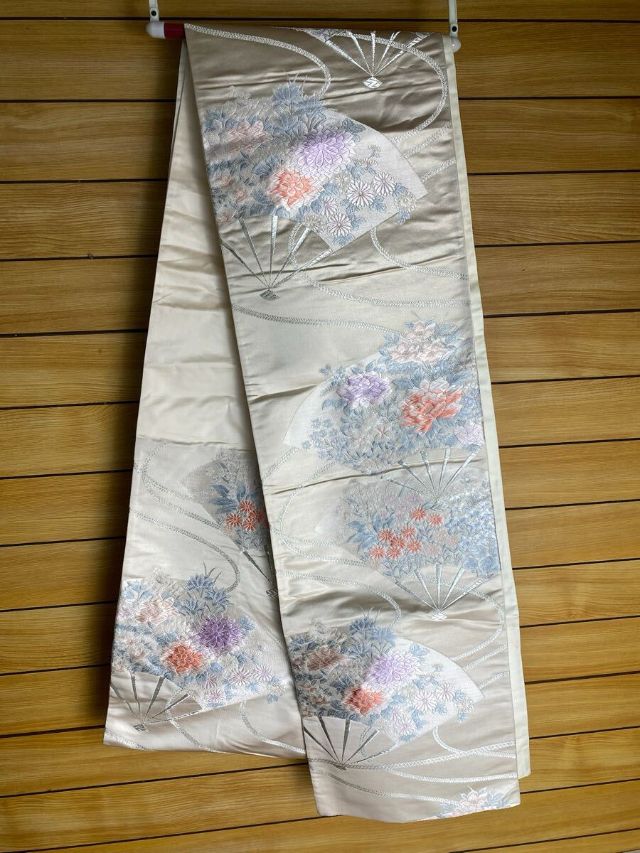 美品! 刺繍 正絹 420cm 扇面 クリーム色 袋帯