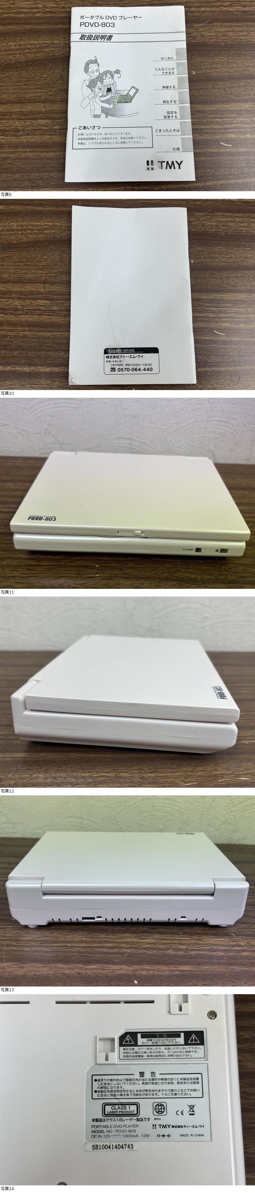 出品の商品は 21474★TMY ポータブルDVDプレーヤー PDVD-803 パールホワイト になります。 出品詳細を最後まで読んで頂き、入札をご検討下さい。 ・画像で詳細・状態をご確認ください。 ・頂き物です。 ・長期間保管品です。 ・本体に目立つ傷や汚れはありません。 ・元箱に傷や汚れがあります。 ・手持ちのDVDを入れて動作確認したところ、映像は見れますが音が一切出ません。 ・付属品は画像に写しているものが全てになります。 ※DVDは付属しません。 ・ジャンク品渡しになります。 ・ご確認したい点があれば、質問よりご連絡ください。 専門知識が必要なご質問にはお答え出来ない事もありますが、可能な限りご返答させて頂きます。 ・画像が全てとなりますので掲載画像をご覧の上ご判断頂きご入札をお願い致します。 | ||||