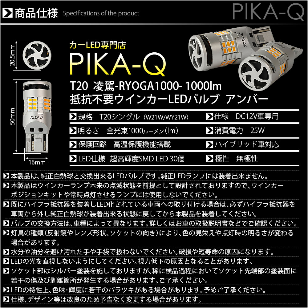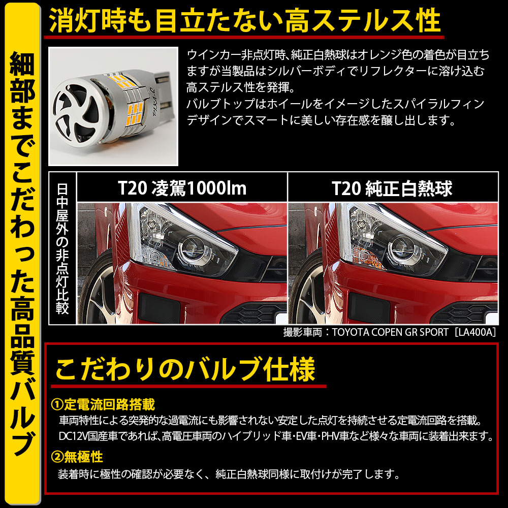 ピカキュウ,LED専門店,LEDバルブ,SMD,LED,T20S,T20シングル,ターンシグナルランプ,ハイフラ抵抗内蔵LEDウインカーバルブ,ハイフラ不要,アンバー,全光束1000lm,凌駕,RYOGA,トヨタ,TOYOTA,コペン,COPEN,GRスポーツ,GR SPORT,LA400A,ダイハツ,DAIHATSU,LA400K