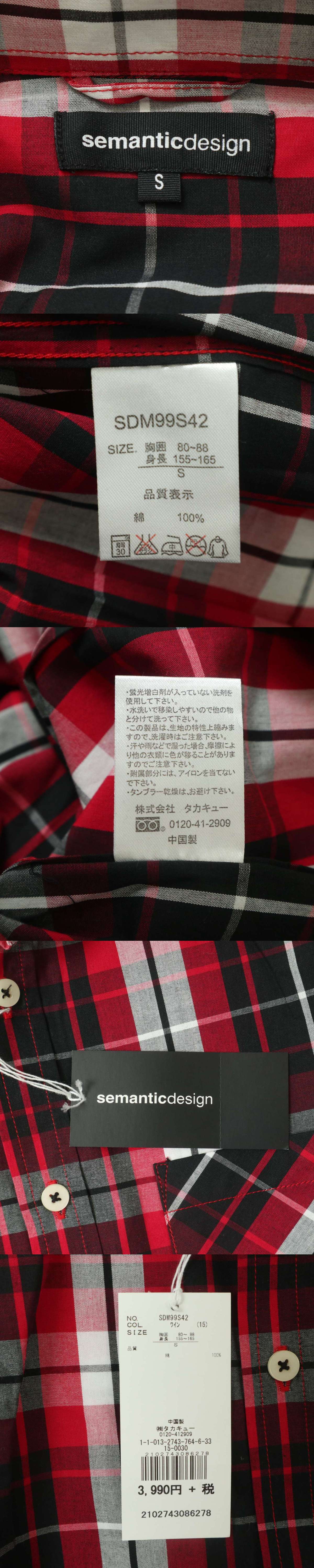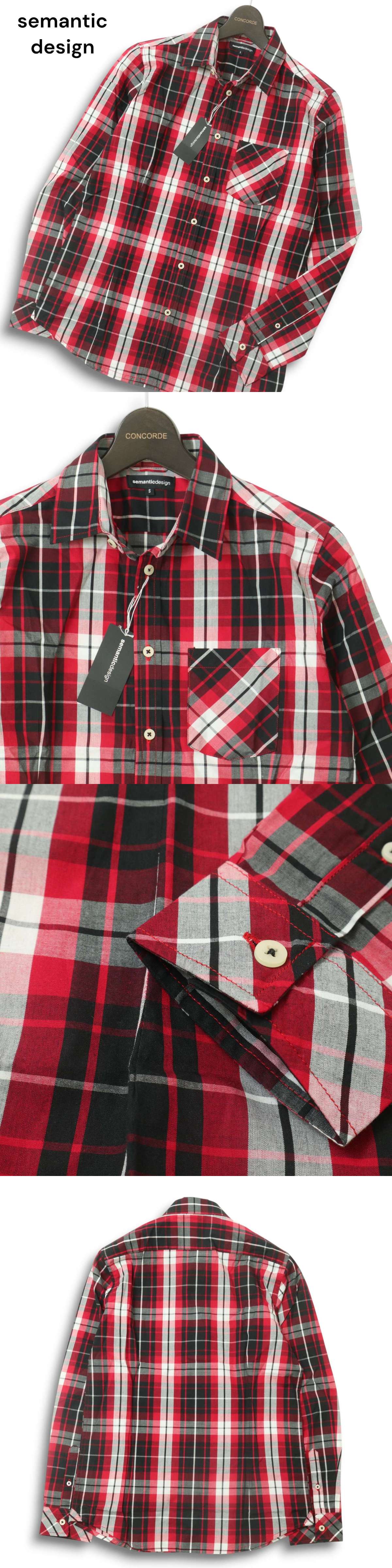 【新品 未使用】 semantic design セマンティック デザイン 通年★ 長袖 スリム チェック シャツ Sz.S メンズ 收藏