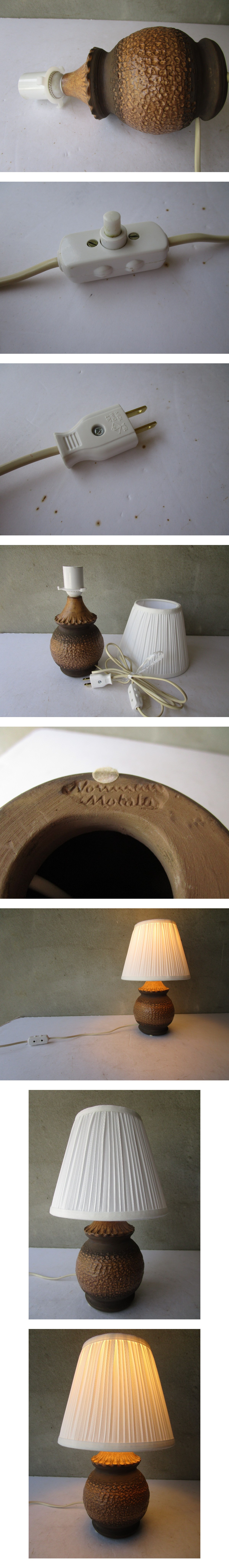 本体■高さ:約23.5cm(シェード込み約31.5cm) ■最大部の径:約12.5cm ■底面の径:約7.5cm シェード■高さ:約15cm ■上面の径:約10.5cm ■直径:約19cm ■口金サイズ:E26(日本で最も一般的な電球サイズで、コンビニ、アマゾン等で簡単に手に入ります。)LED電球使用可。60Wくらいまで ■コードの長さ:約1.75m 電線プラグは日本仕様です。■商品の状態:電線部分等の多少の汚れ以外、ヒビ割れ、カケ等特記すべき欠損のない良好な状態です。シェード(ホルダー式)は後付けの品物で、掲載画像の通り、ソケット部分の3点固定のアダプターにはめ込んで使用します。■その他:底面に工房の銘の刻印があります。コード部分に中間スイッチがあります。