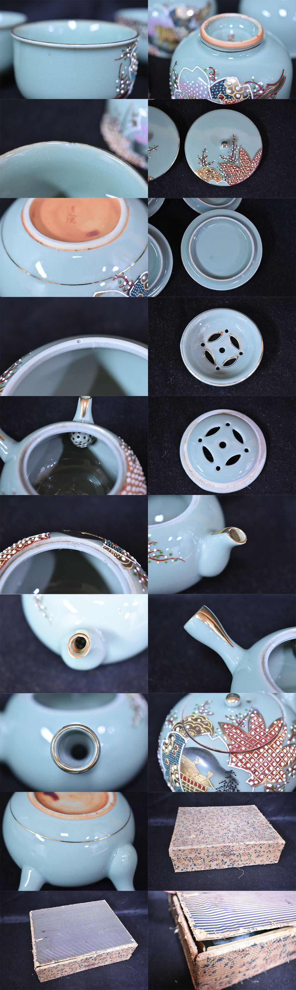 清水焼/京焼/青磁/急須/茶こぼし/煎茶碗/4客/茶器セット/煎茶道具/茶器/煎茶器揃/茶道具/四季折々/いっちん技法の出品になります。 コンディション 経年による傷や汚れがあります。箱は梱包資材として使用しますが底が抜けており劣化しております。 上記の点をご理解ご了承いただいた上で、ご入札お願いいたします。 |
