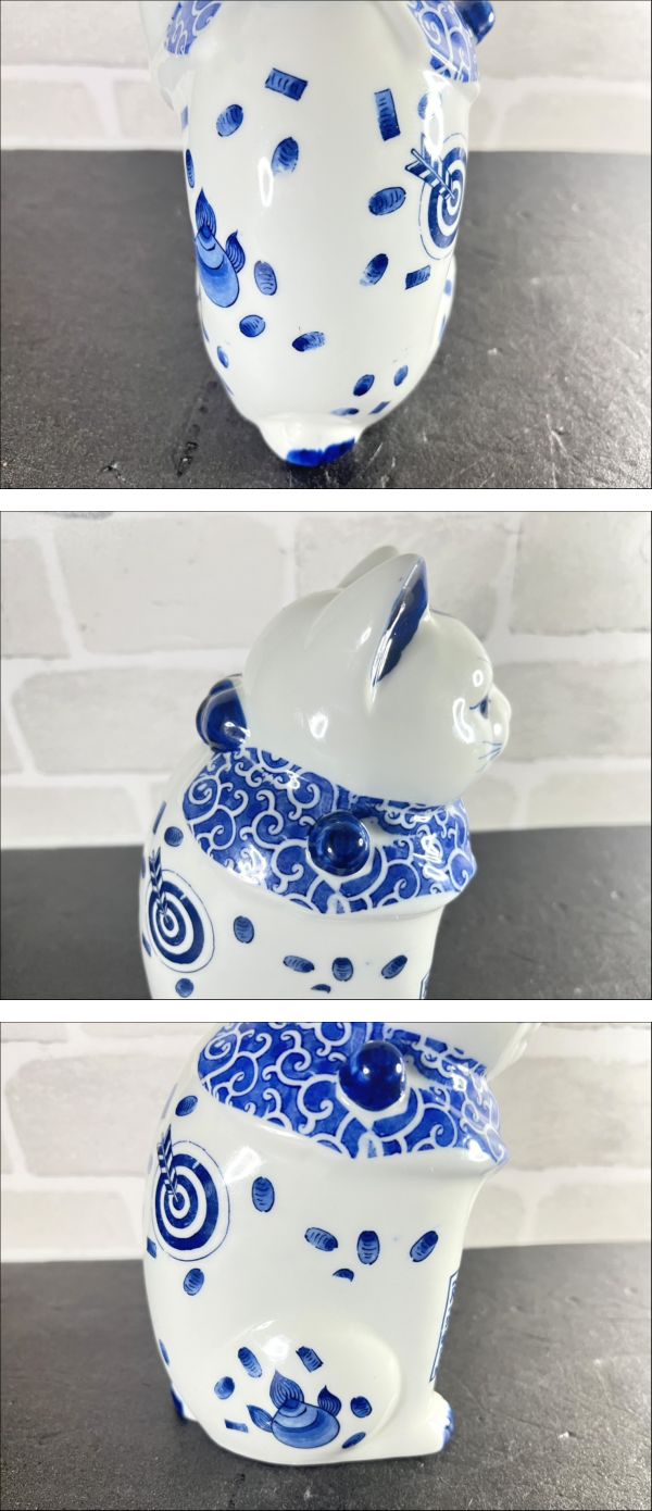 瀬戸焼 招き猫 日本製 染付猫磁気 貯金箱 ホワイト柄 商売繁盛 千客万来 人招き 瀬戸物 縁起物 中古品 收藏