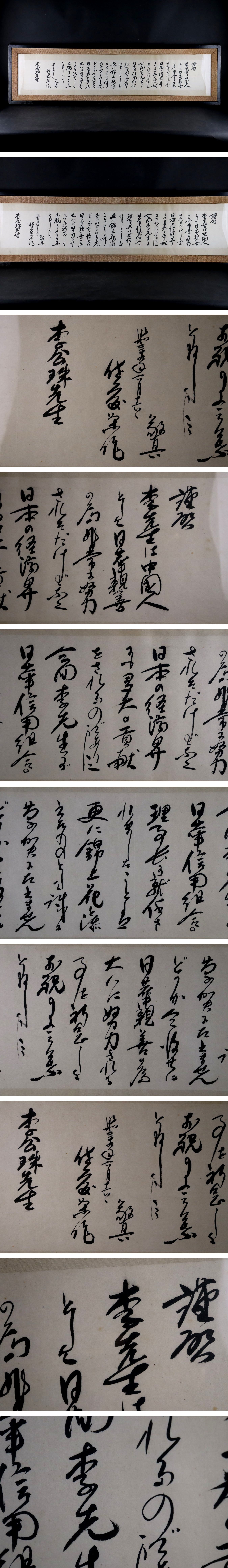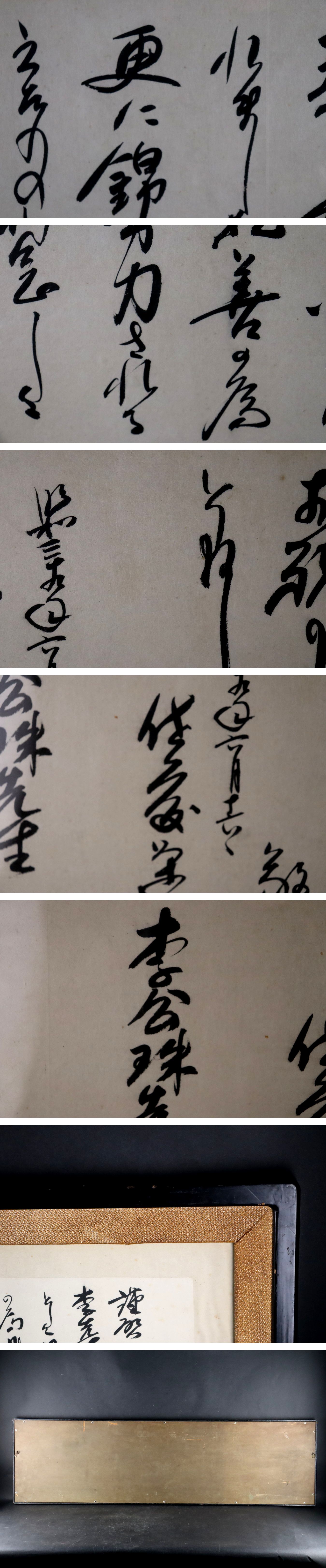 額 横:136cm 縦:38.5cm 画 横:116cm 縦:19cm 額にスレ傷、傷有 写真にてご確認ください。 注意事項 ご入札は慎重にお願い致します。 状態は画像にてご確認お願い致します。 鑑定を受けたもの、本物保証できるものにつきましては明記しております。 それ以外については未鑑定品、道具の真贋保証はございませんので、自己責任において入札にご参加下さい。 タイトル・商品説明欄に「保証」と記載されたもので、個人的見解を除き 公的に認められた所定鑑定人及び機関の鑑定により贋作と判明した場合は、落札代金のみ返金致します。 鑑定料及びそれに伴う送料等の経費は負担出来かねます。すり替え等防止のため落札日から2ヵ月までを猶予とさせていただきます。 時代・作家名・状態・材質等は主観に基づき確定するものではありません。 古物の為、全て漏らさず情報を掲載することは困難です。 よって画像や説明文以外にも汚れスレなど経年損傷あることを前提の入札とし、 与えられた画像と説明より入札者の見識による総合的な価値判断に基づいて入札されたものであると判断致します。 その為、万が一掲載画像と説明文の情報の遺漏、誤記があった場合においても 入札後及び商品受取後にその点を事由とした入札の取消、返品はお受けできません。 予めご了承ください。 わかる範囲での質問にはお答えしますので、ご不明な点等御座いましたら事前にご質問ください。 質問回答・落札連絡が遅れる場合があります。 出来る限り迅速に対応出来る様心掛けておりますごのでご了承お願い致します。 ご入札後の落札者都合によるキャンセルや返品は固くお断りしております。 事前に写真等よくご確認のうえご入札ください。 返品不可(お客様の主観による理由での返品はお受けしかねます。) イタズラと思われる入札、評価の悪い方からのご入札は、 独自の判断で入札取り消しの処置を取らせていただく場合が御座います。 配送方法はこちら指定業者にてお送りさせていただいております。予めご容赦ください。 ※配達業者の指定や着払い等の対応できません。 配送時の破損につきまして額に関しては作品を販売しており額縁などの破損につきましては保険適用外となります。ご了承ください。 その他恐れ入りますが、落札後は『48時間以内』にお客様情報の入力をお願いいたします。 以下の流れでご対応ください。 【1】情報入力画面にてお客様情報を入力してください。 【2】お客様情報入力後に自動配信されるメールで合計金額を確認し、 『7日以内』にご指定の支払い方法でご入金手続きをお願いします。 →の規約変更によりこちらに番号が表示されなくなりました。 商品が高額な物も含むため取引メッセージにて連絡の取れる電話番号を記載お願いします。 落札後のキャンセル・返品は原則承っておりません。 ご了承いただける方のみ、ご入札をお願いいたします。