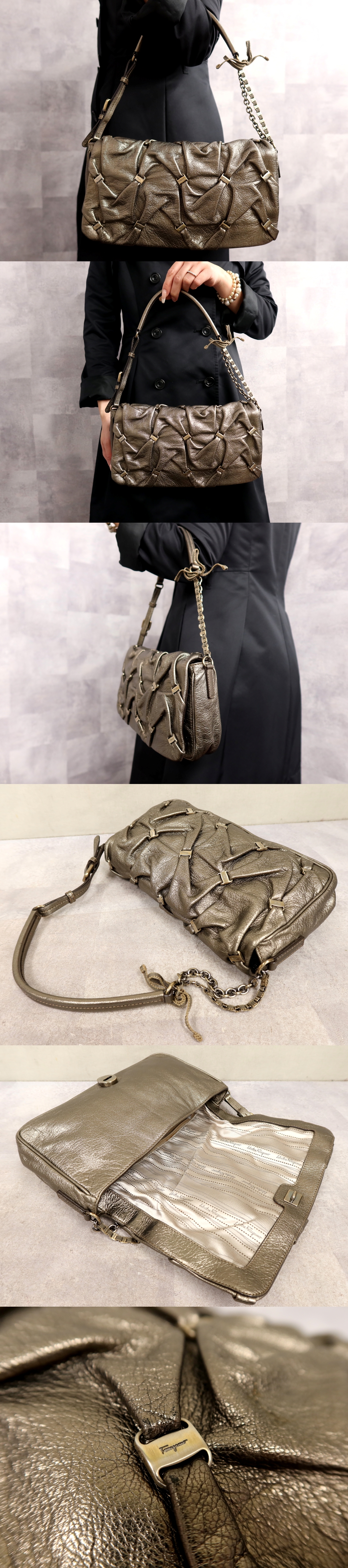●超美品●Salvatore Ferragamo フェラガモ●ヴァラ●カーフ レザー 本革●ショルダー バッグ●シャンパンゴールド●腕掛け●収納●Js65687 收藏